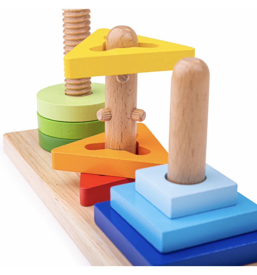 Votre enfant devra se concentrer et travailler sa patience pour tourner, visser et dévisser les formes en bois.