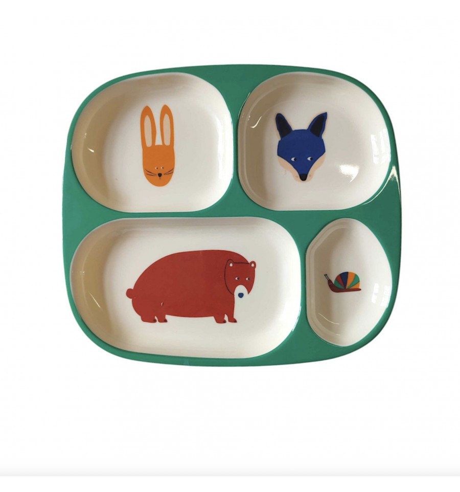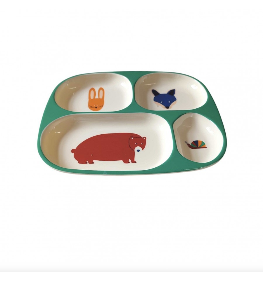 Cette grande assiette est divisée en 4 parties de tailles différentes, on y retrouve le lapin, le renard, l'ours et l'escargot qui assurent un rôle primordial veiller sur le repas de votre chérubin.