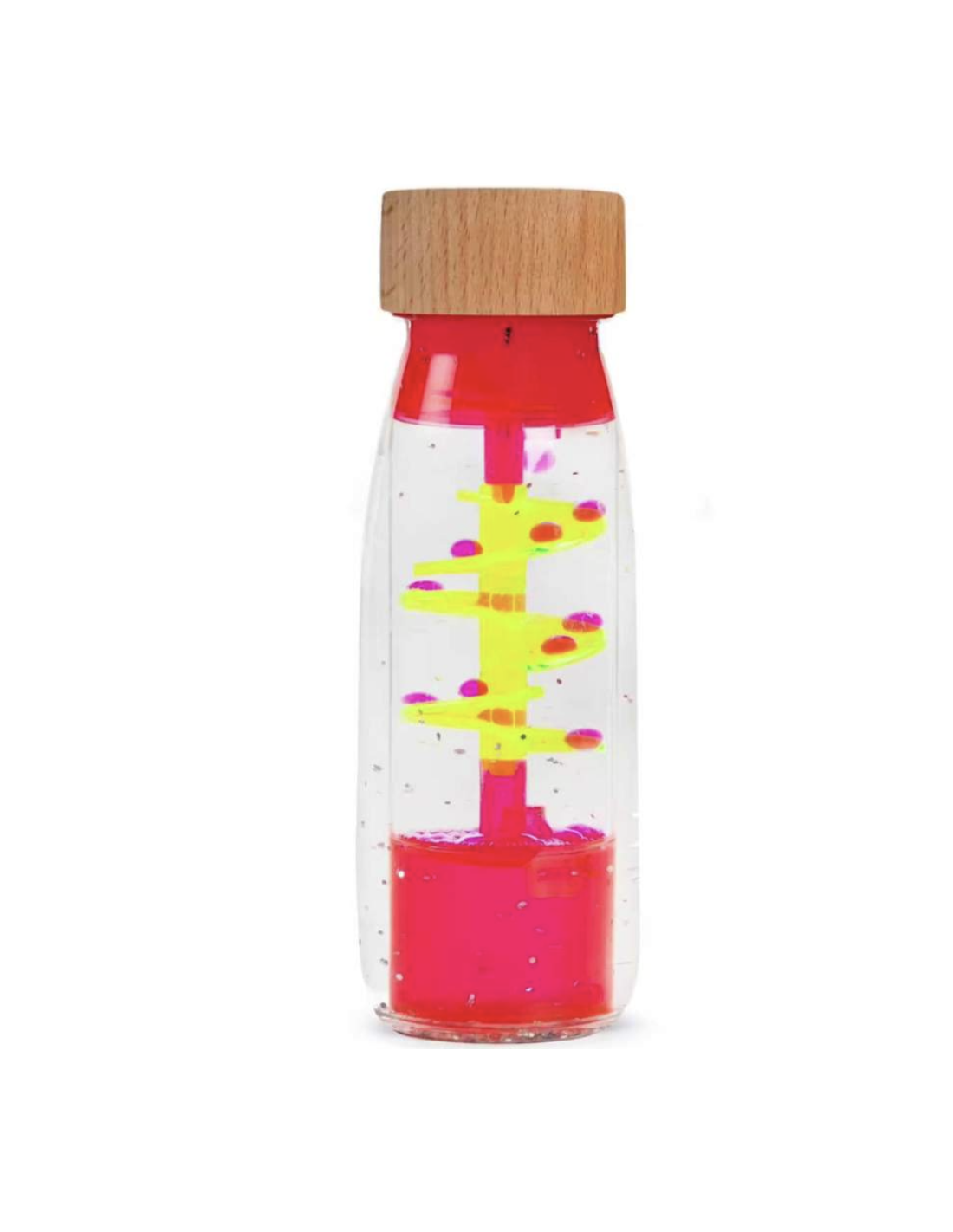 Petit Boum a imaginé une bouteille sensorielle sécurisée pleine de magie, avec un bouchon en bois d'érable.