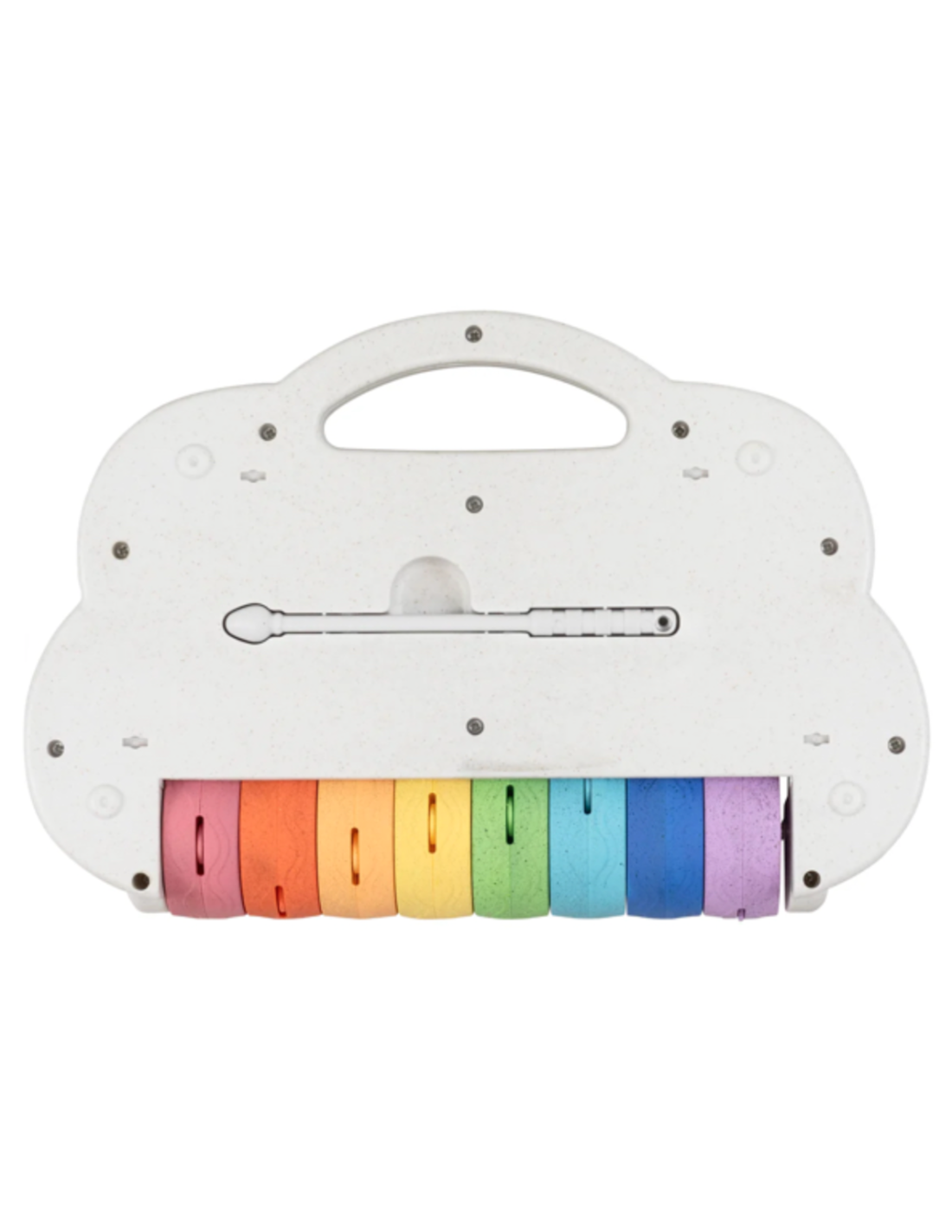 Composé de 8 touches métalliques et de 8 rouleaux aux couleurs de l'arc-en-ciel, ce xylophone en bioplastique, en forme de nuage fera le bonheur de vos petits loups.