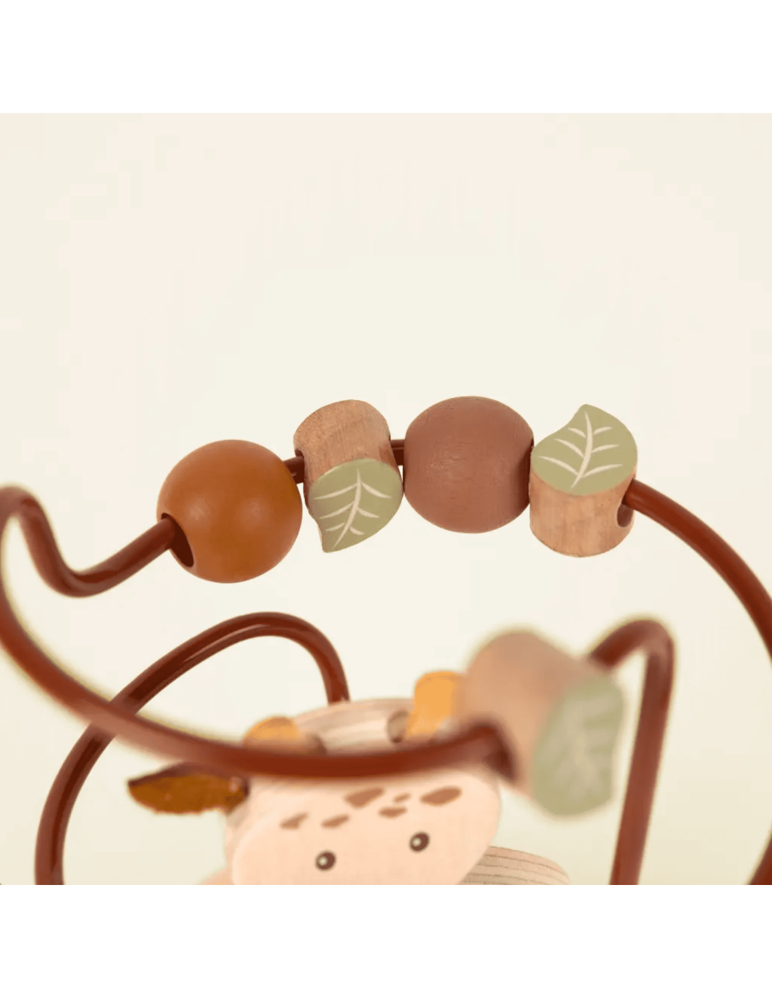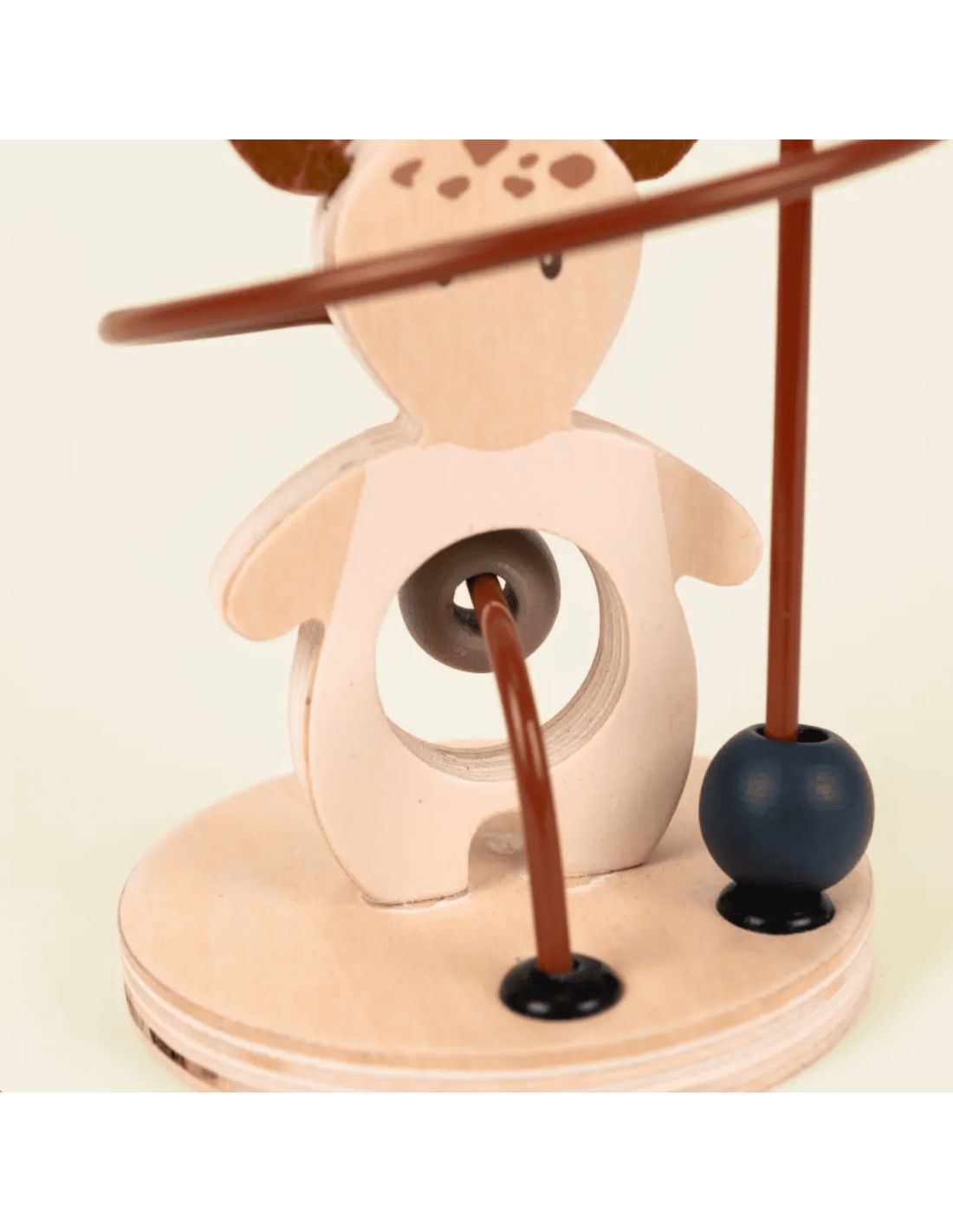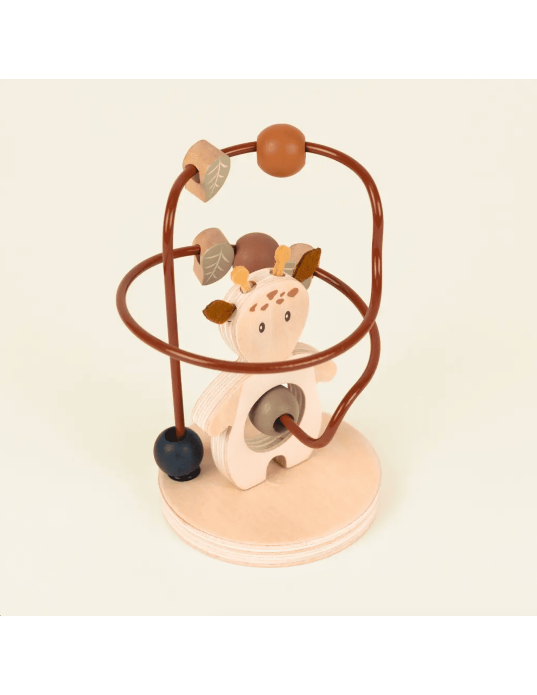 Cette girafe en bois est entourée d'un long fil qui serpente tout autour avec des billes en bois (perles et feuilles). L'objectif est de les faire glisser d'une extrémité à l'autre.