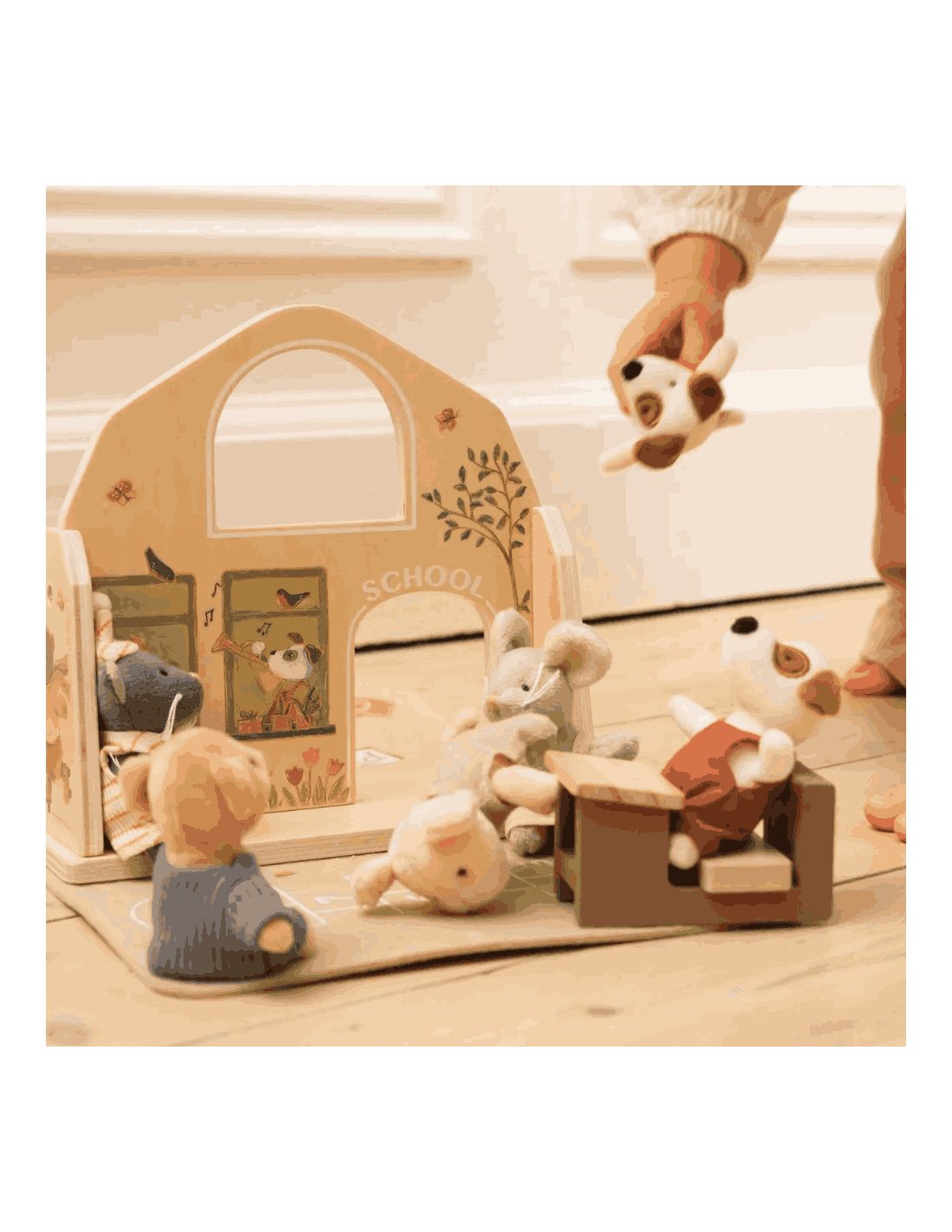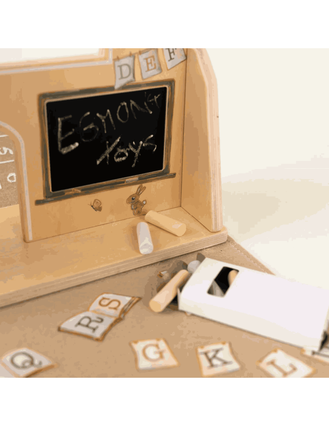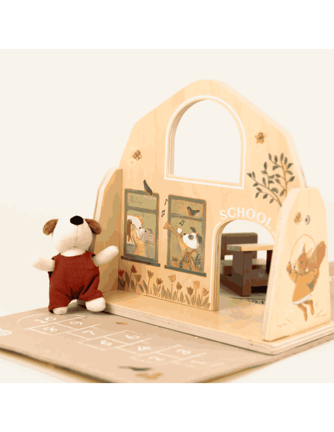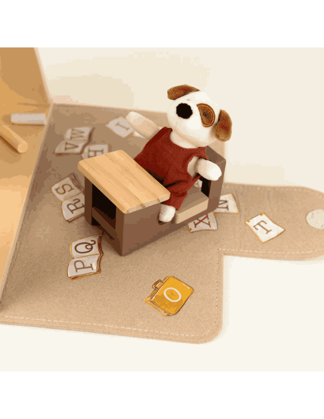 Cette adorable mallette s'ouvre et se transforme en école avec un pupitre en bois et Eddie, le petit chien en peluche.