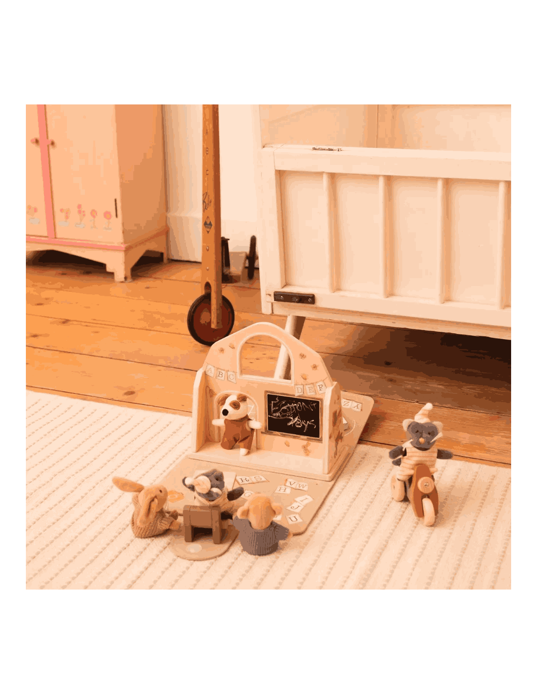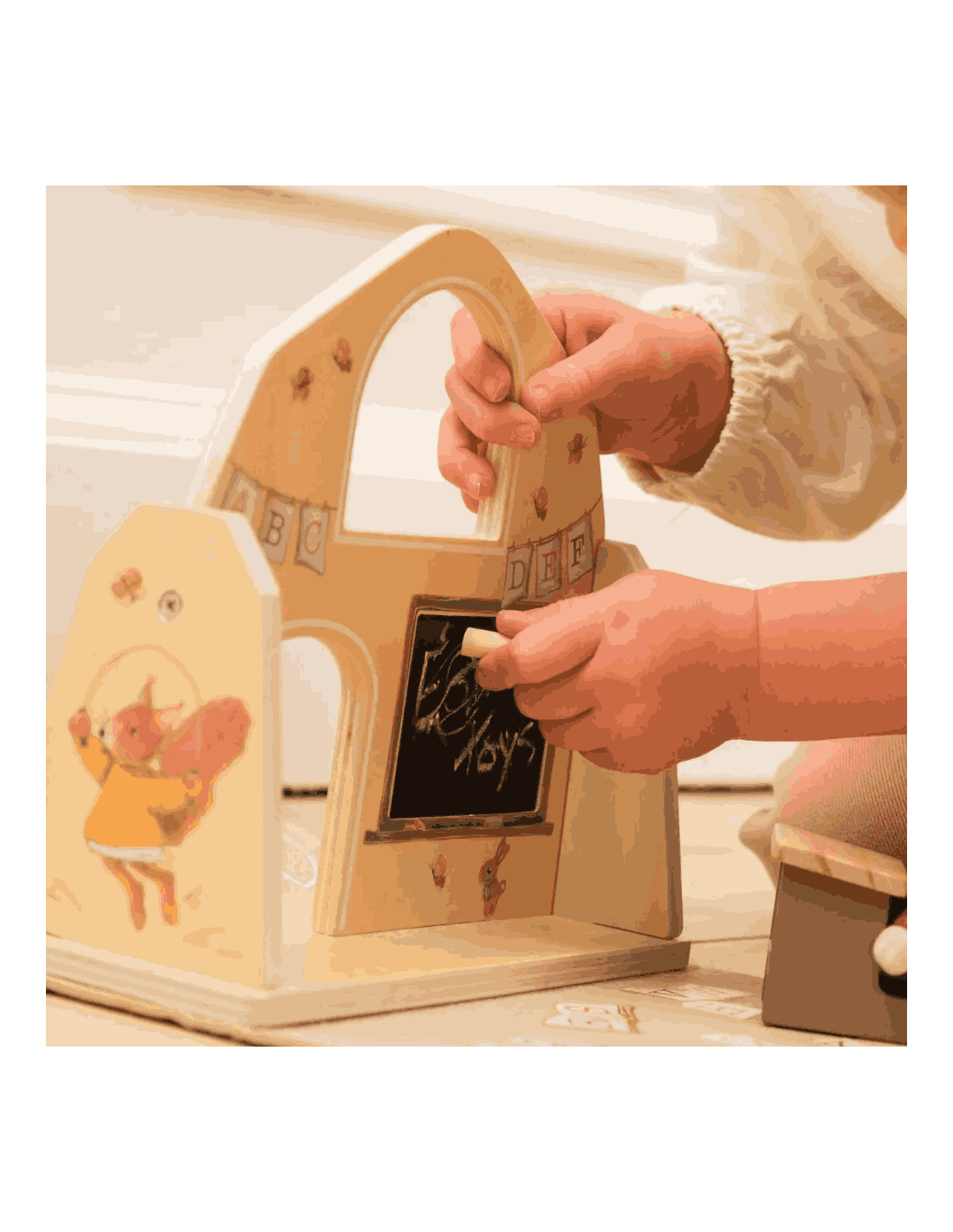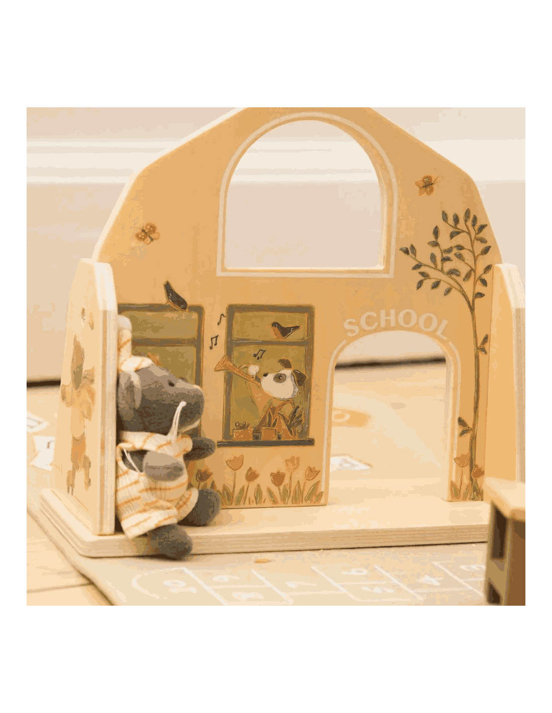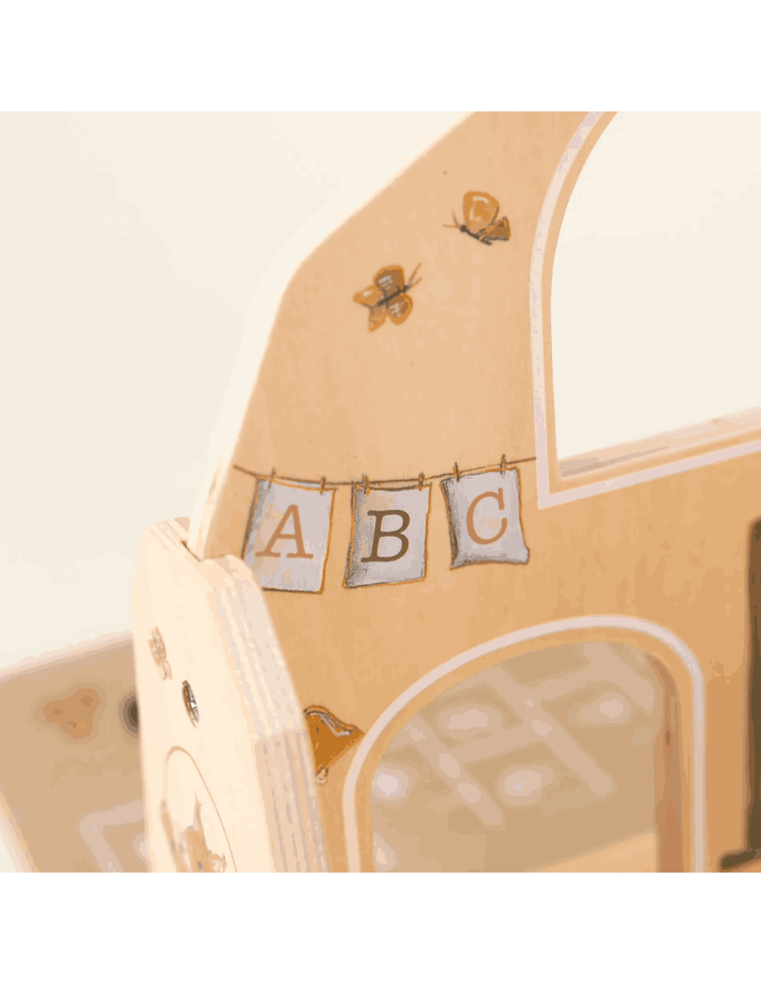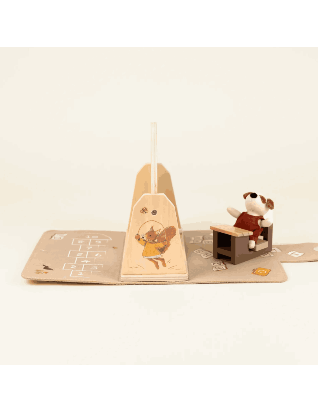 Sa structure centrale est en bois tandis que les côtés sont en feutre, tous joliment illustrés par des dessins tendres sur le thême de l'école.