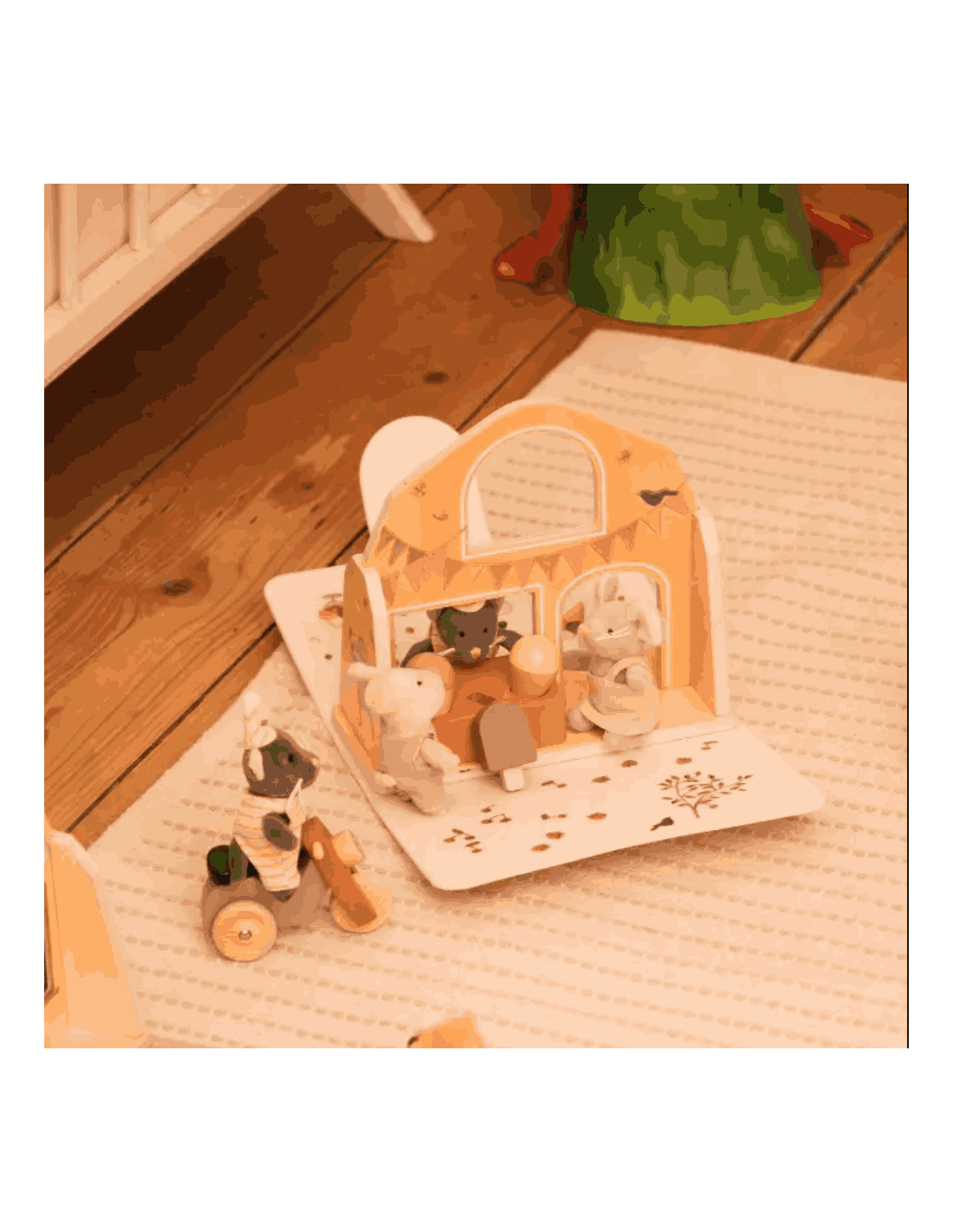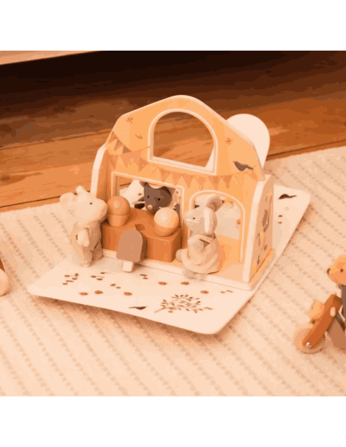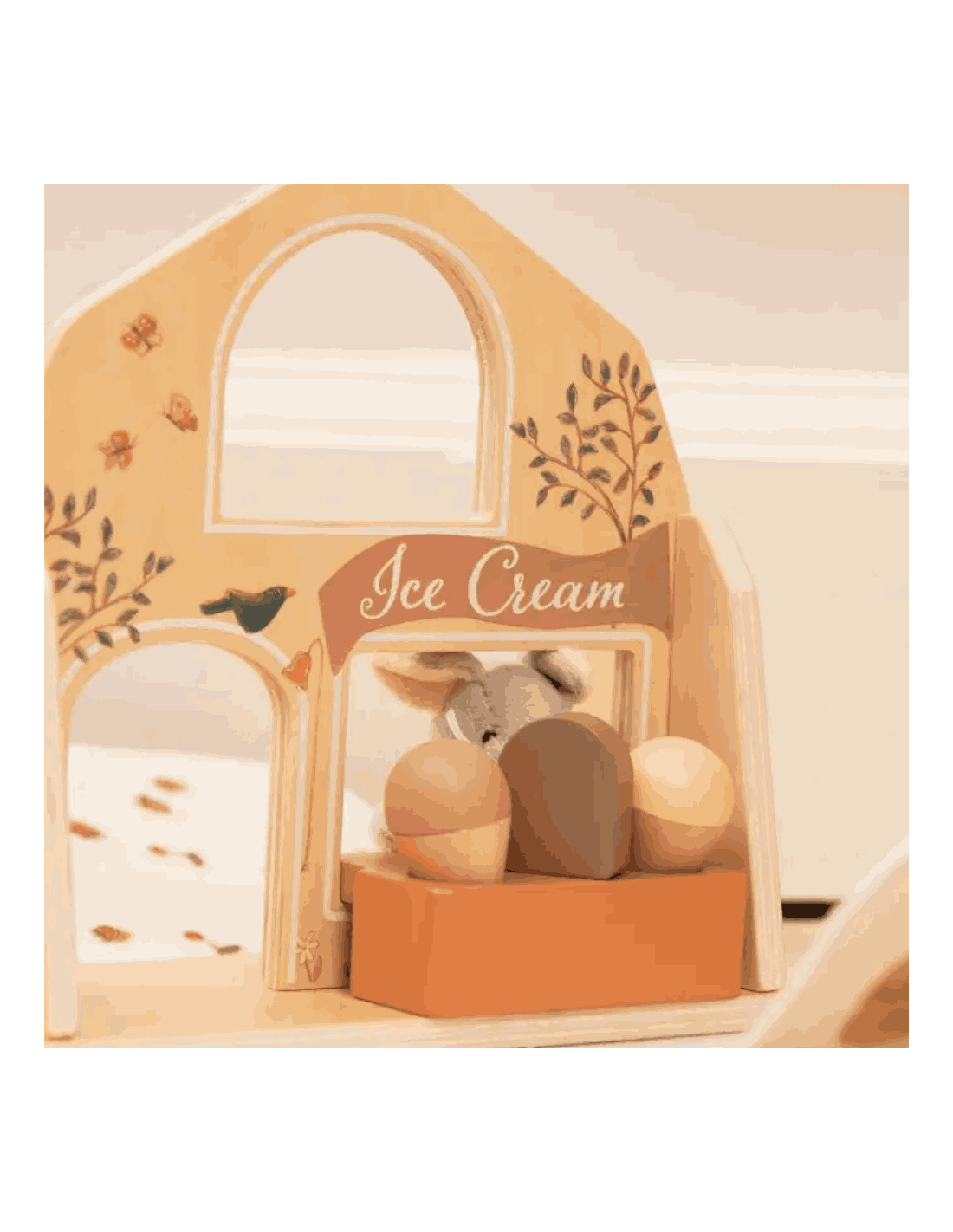 Cette adorable mallette s'ouvre et se transforme en marchand de glace avec un comptoir en bois et Agathe, la petite souris en peluche.