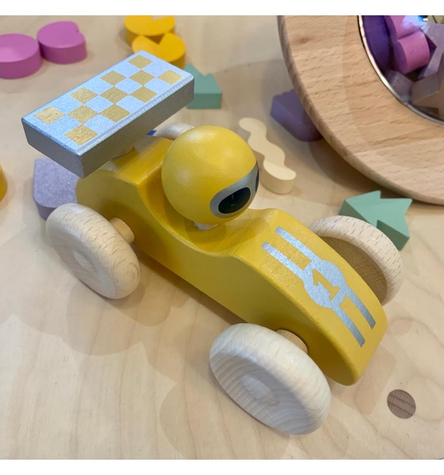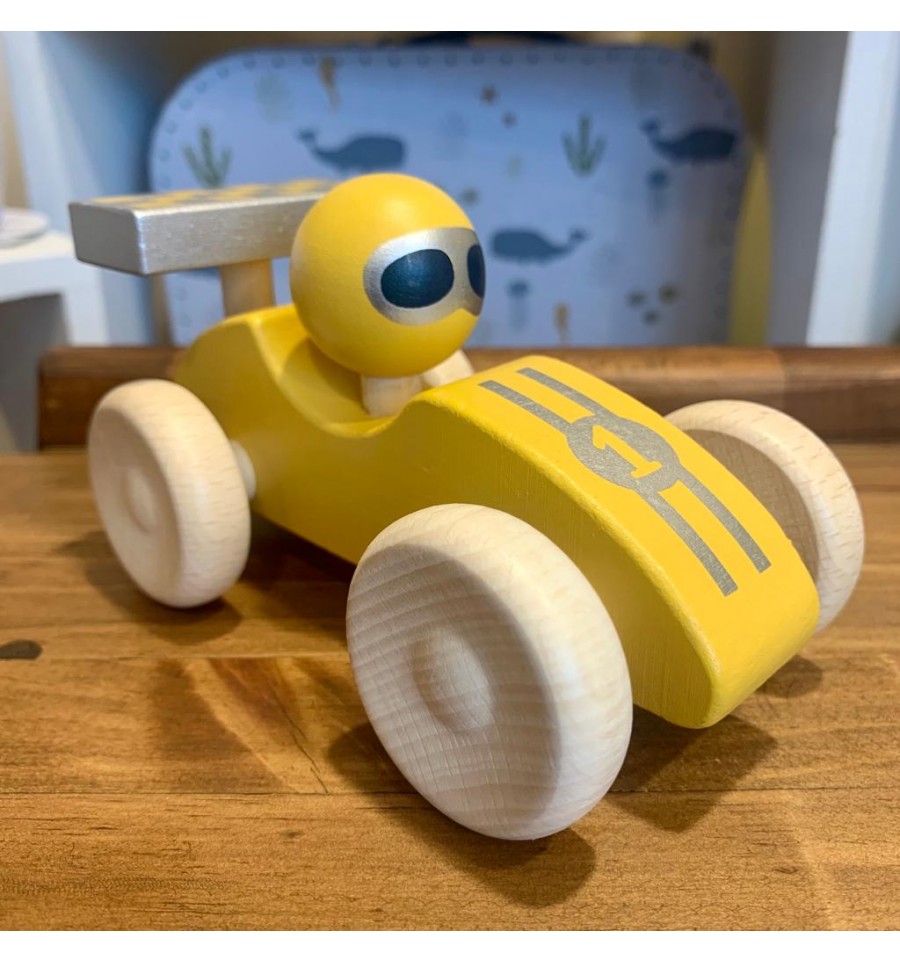 Avec cette jolie voiture de course en bois jaune, vos enfants vont pouvoir jouer des heures !