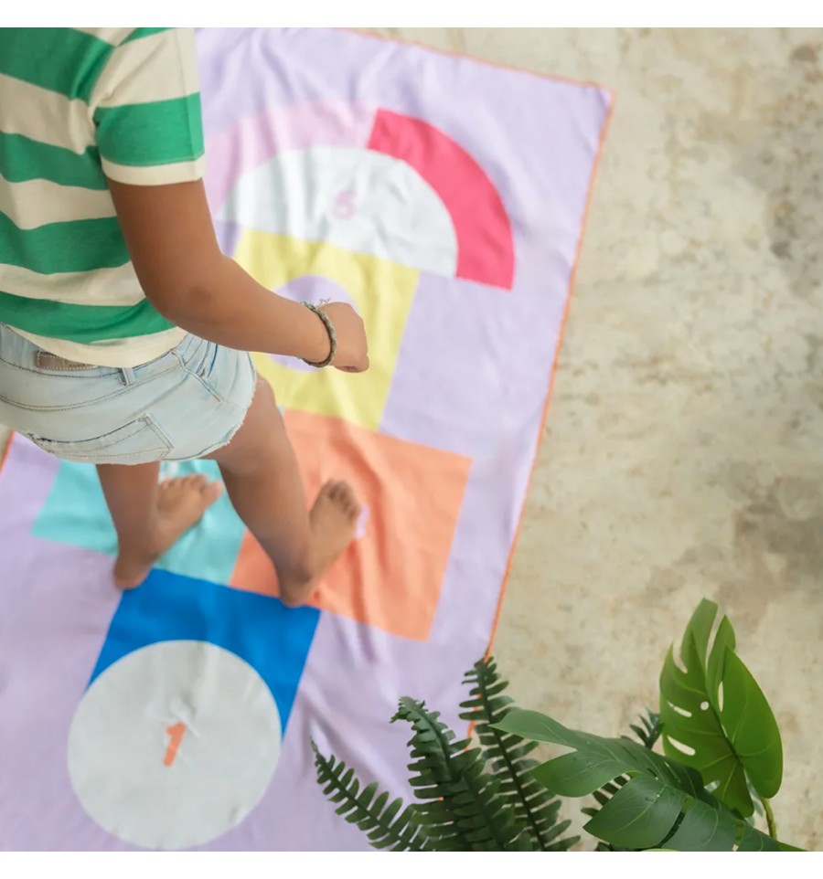 D'un côté, vous trouverez un imprimé marelle, topissime pour jouer avec seul ou entre amis et occuper vos petits loups pendant un moment, et de l'autre, un imprimé graphique à rayures.