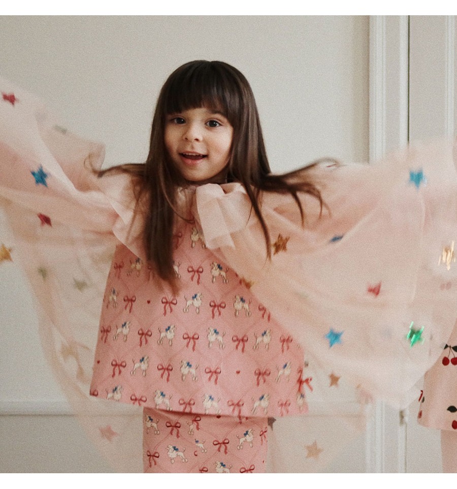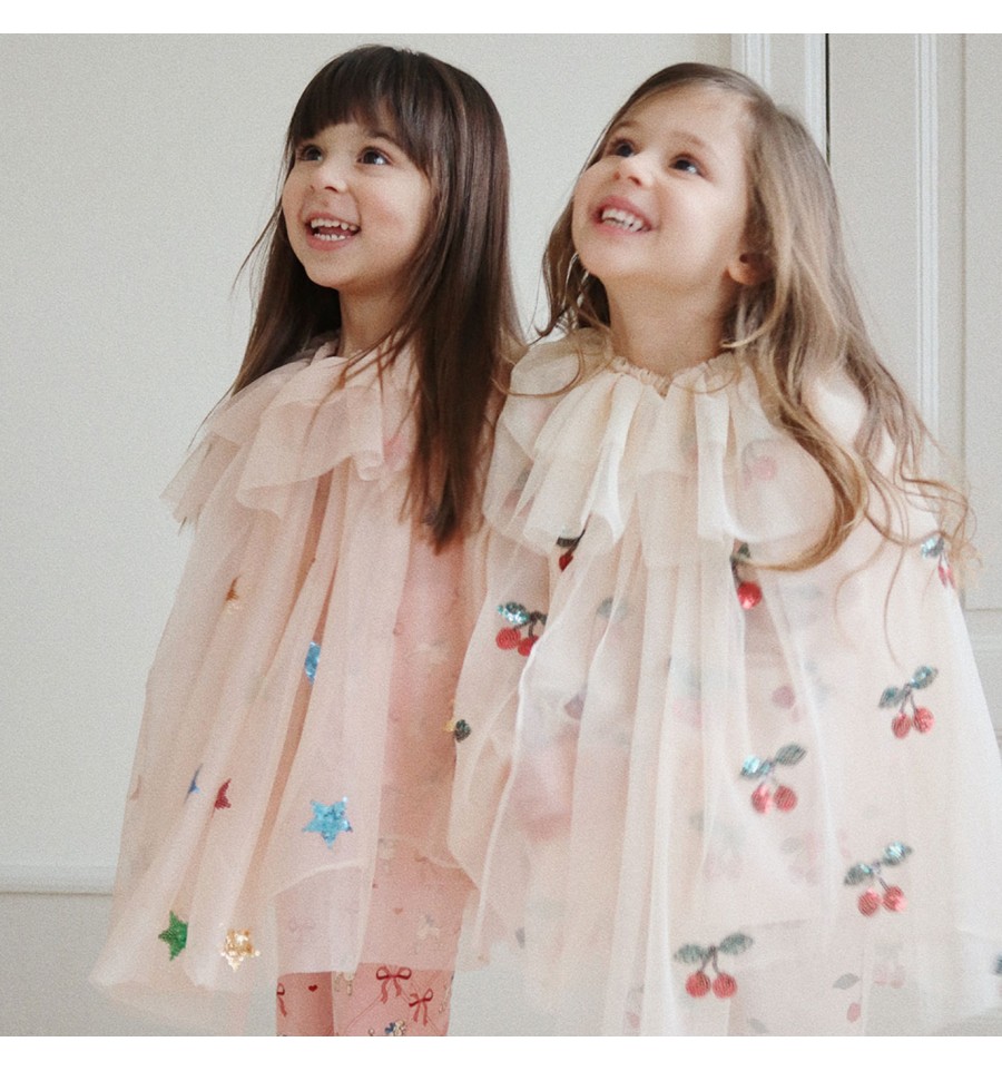 Cette sublime cape rose en tulle est parsemée de grandes étoiles en sequins brillants multicolores.
