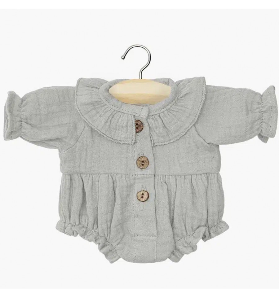 Cette barboteuse "Léonore" en gaze de coton couleur Gris Souris convient aux poupées de 34 cm.
