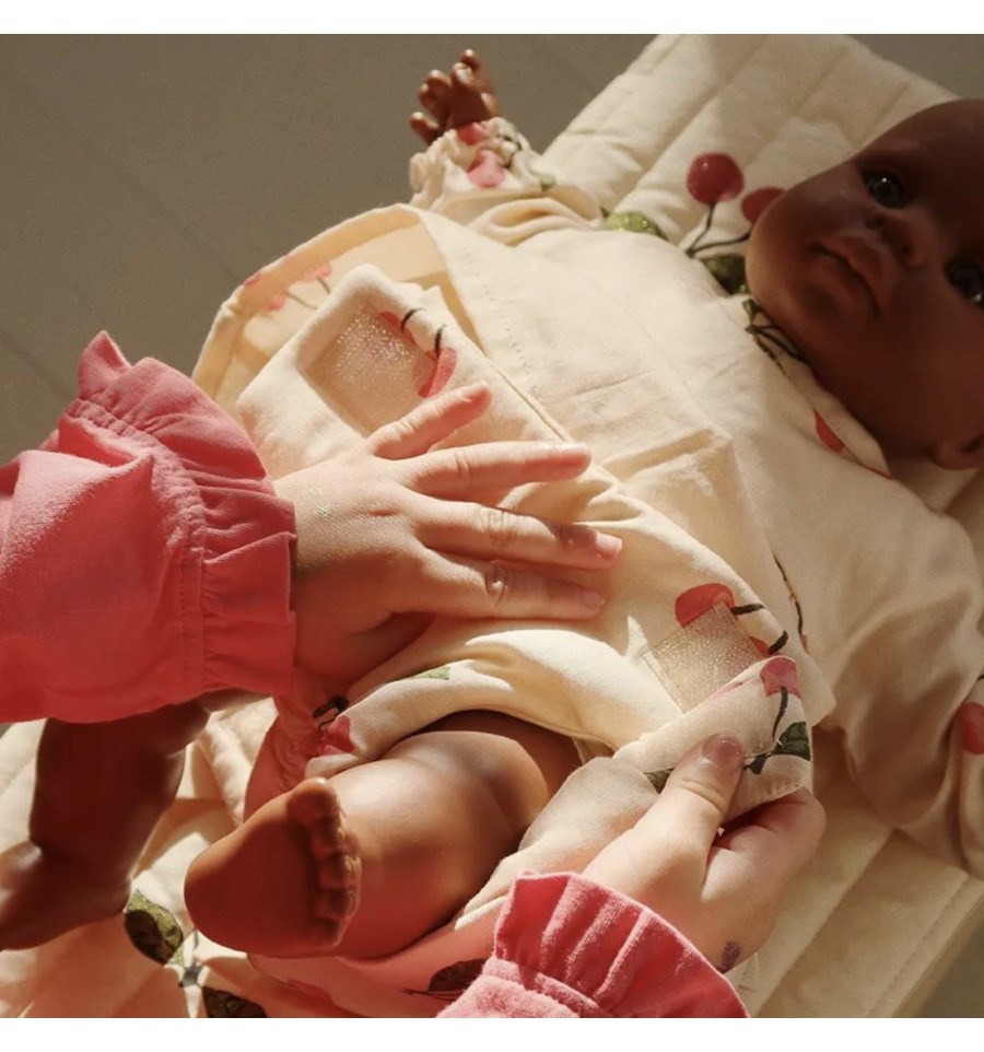 Joli, pratique, tendance, les adjectifs ne manquent pas pour décrire cet ensemble pour poupée décoré de cerises.