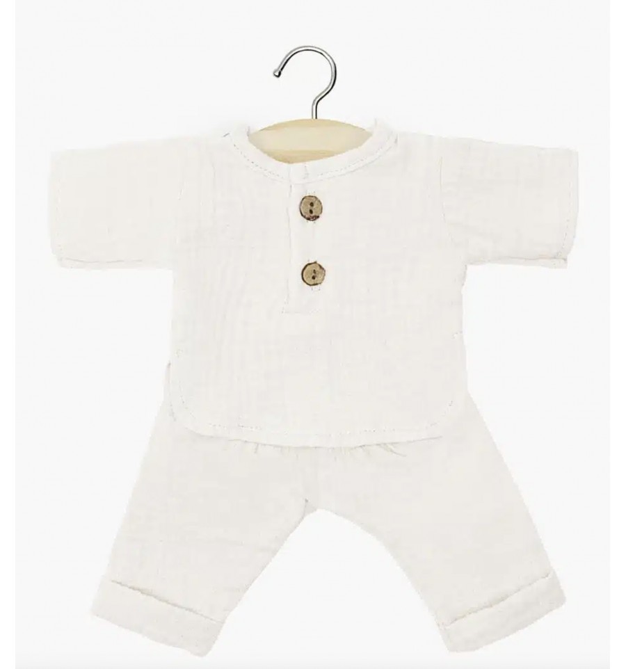 Tout doux en gaze de coton couleur écru, il est composé d'un pantalon et d'un haut manches longues.
