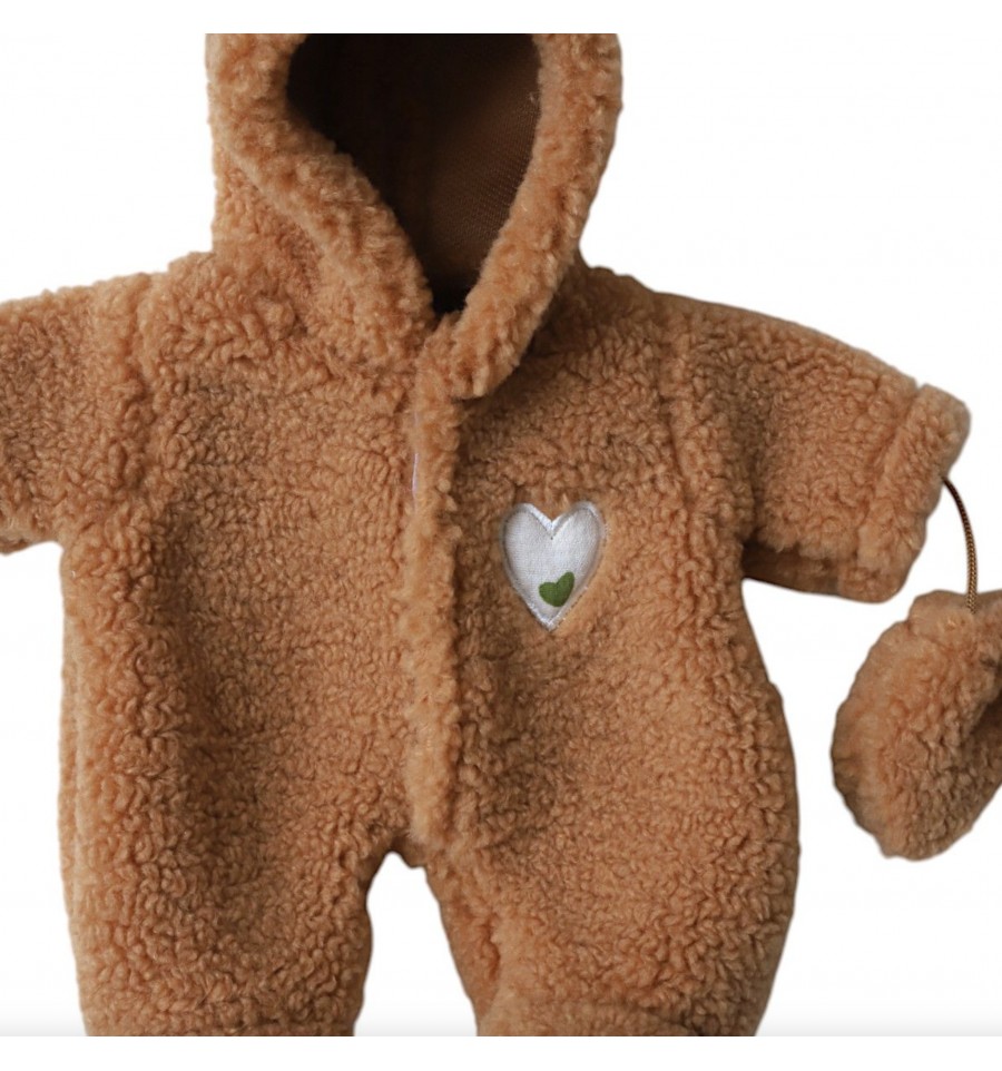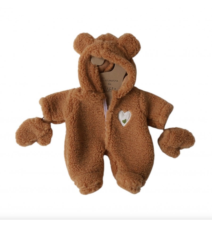Voici une combinaison à ajouter au dressing de la poupée de votre enfant. Parfaite pour les journées froides d'hiver, votre poupée sera bien couverte grâce à la capuche avec les petites oreilles d'ours et les moufles fixées à la combinaison.
