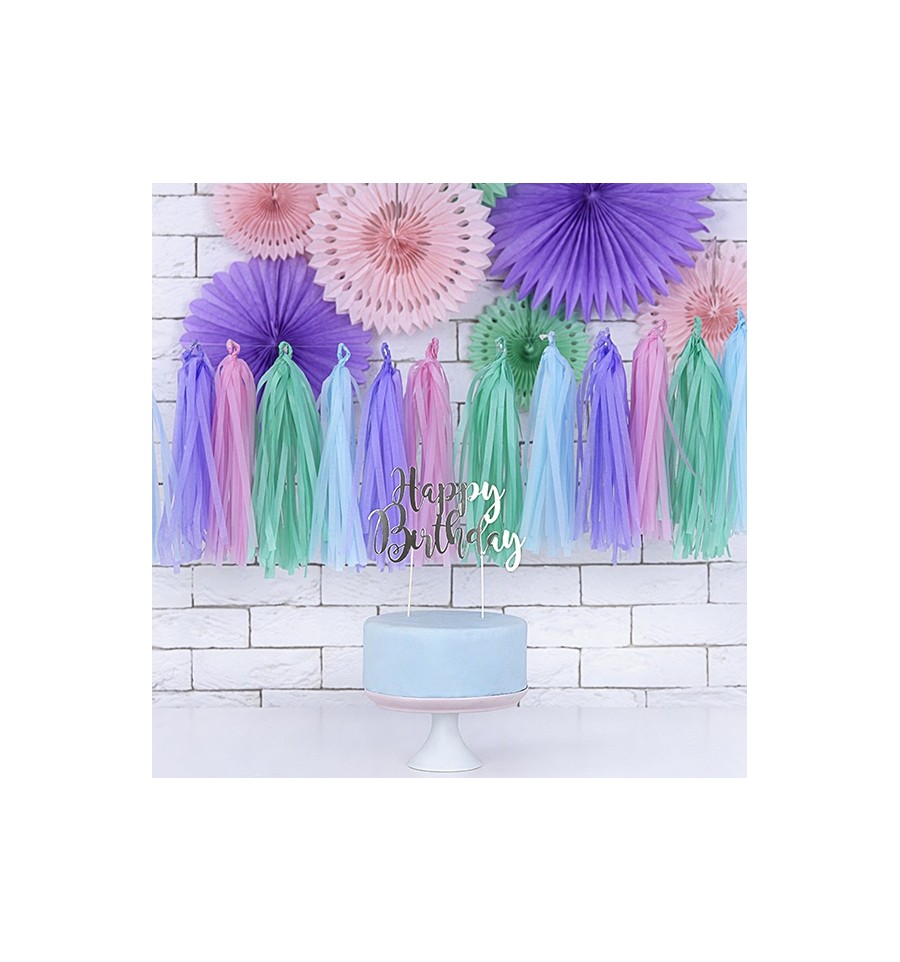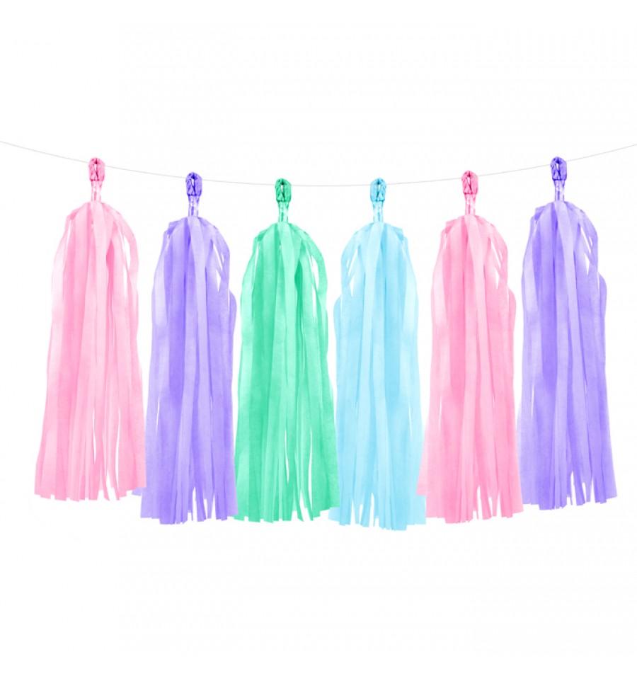 Le set se compose de 12 tassels / pompons de couleurs assorties : 3 rose, 3 bleu, 3 vert, 3 violet