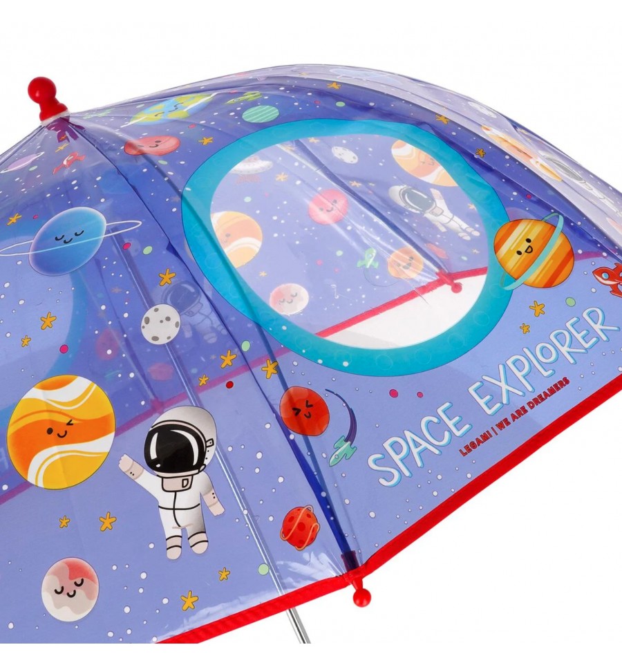 Recouvert de planètes, d'étoiles, ce parapluie aux multiples couleurs est doté d'un rond transparent qui permet à l'enfant de voir à travers comme dans un casque de cosmonaute : pratique et fun !!