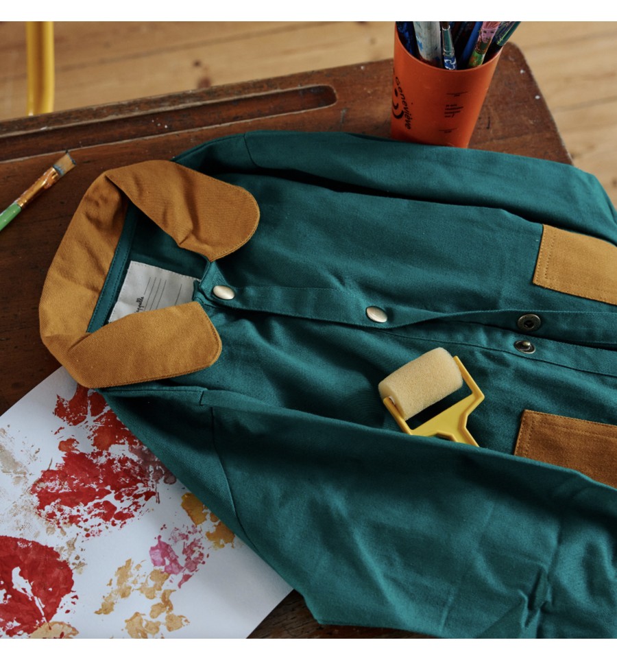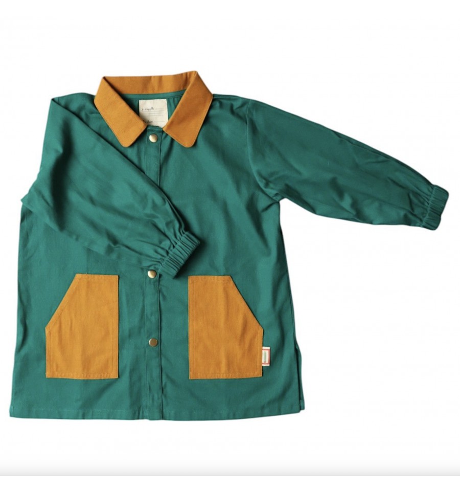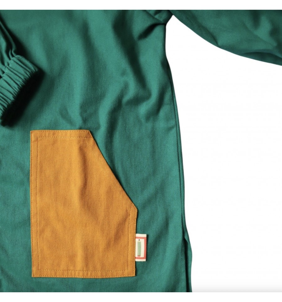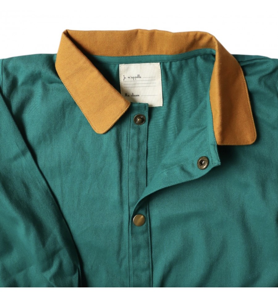 D'une belle couleur verte émeraude avec des détails marrons, on adore vraiment son style écolier remis à la mode actuelle, pratique il y a des élastiques aux poignets et des poches pour y protéger mouchoirs ou autres petit trésors découverts dans leurs nombreuses expéditions quotidienne. Pour finir il est simple à mettre grâce à ses boutons pressions