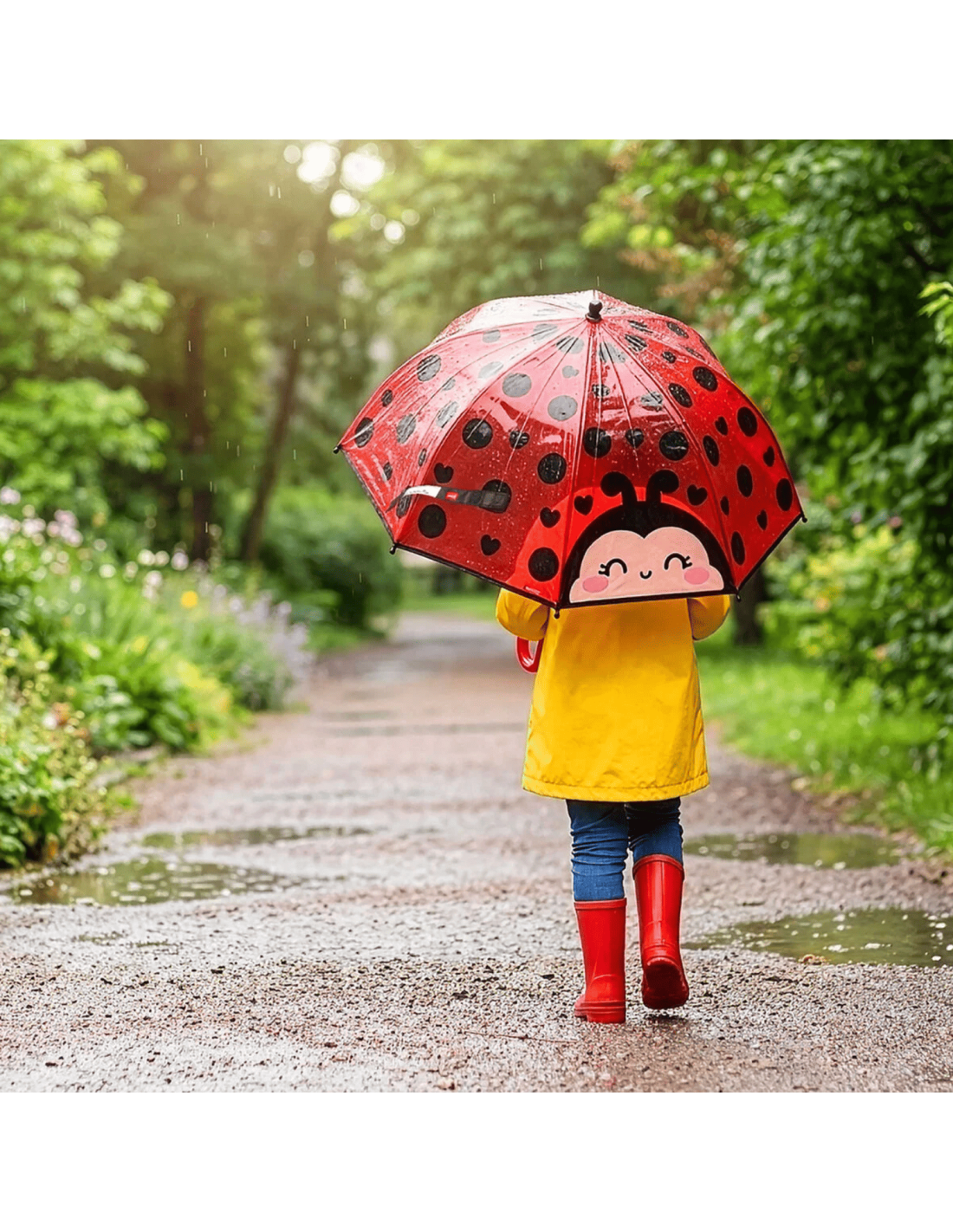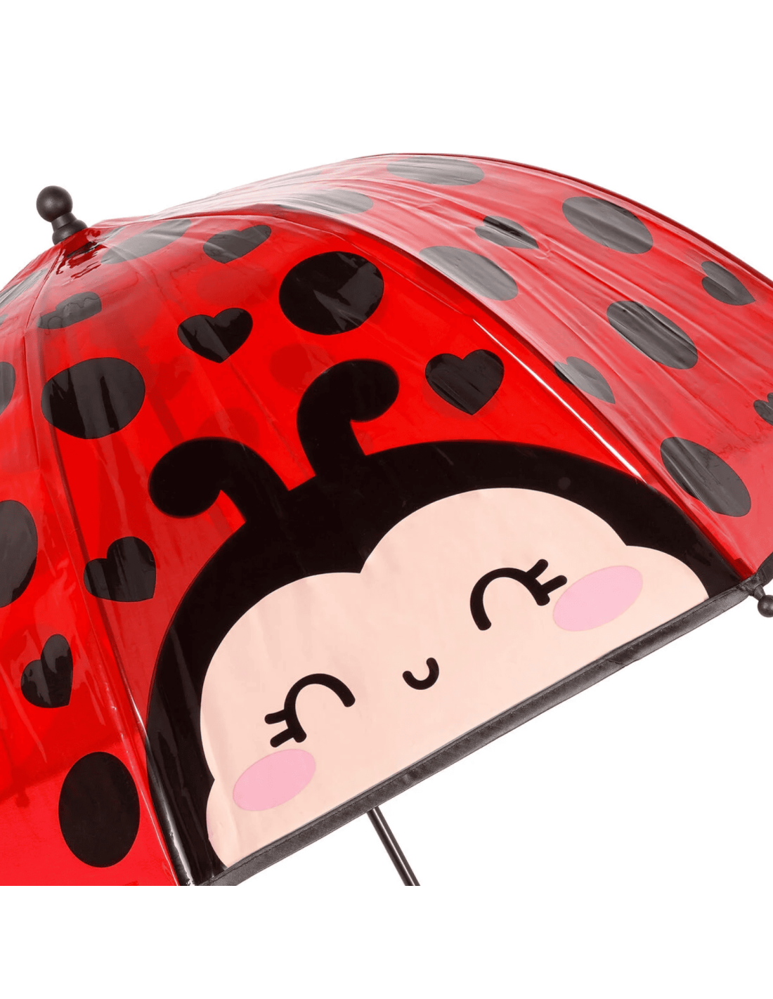 Recouvert d'une coccinelle souriante ce parapluie donne envie de danser sous la pluie en chantant à tue tête.