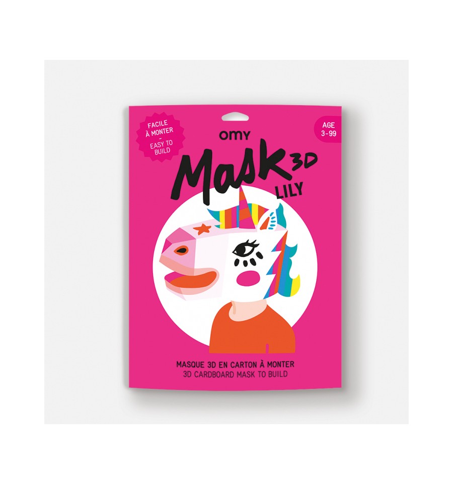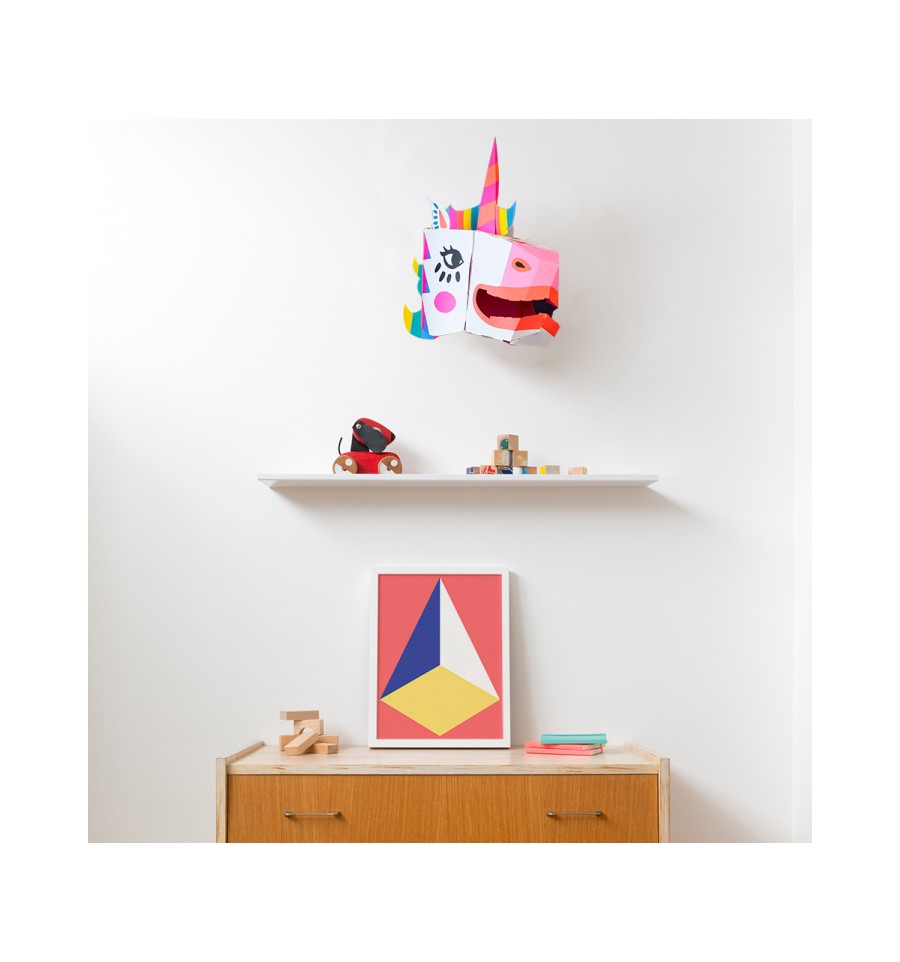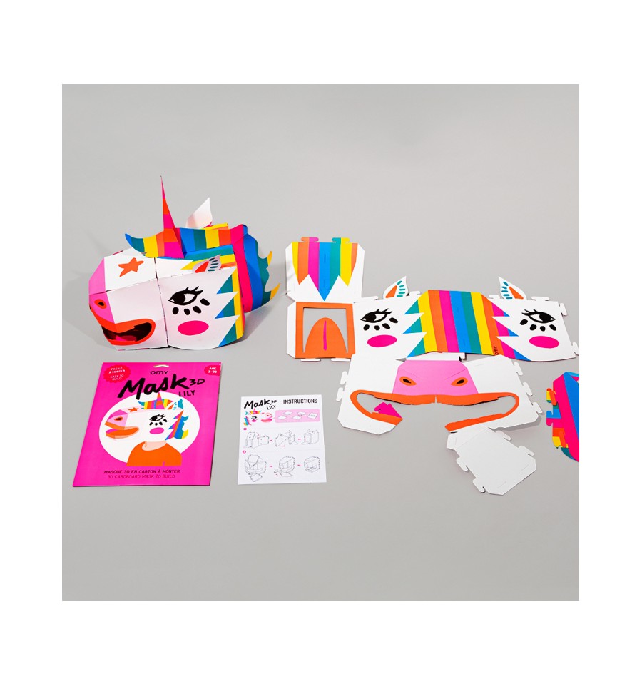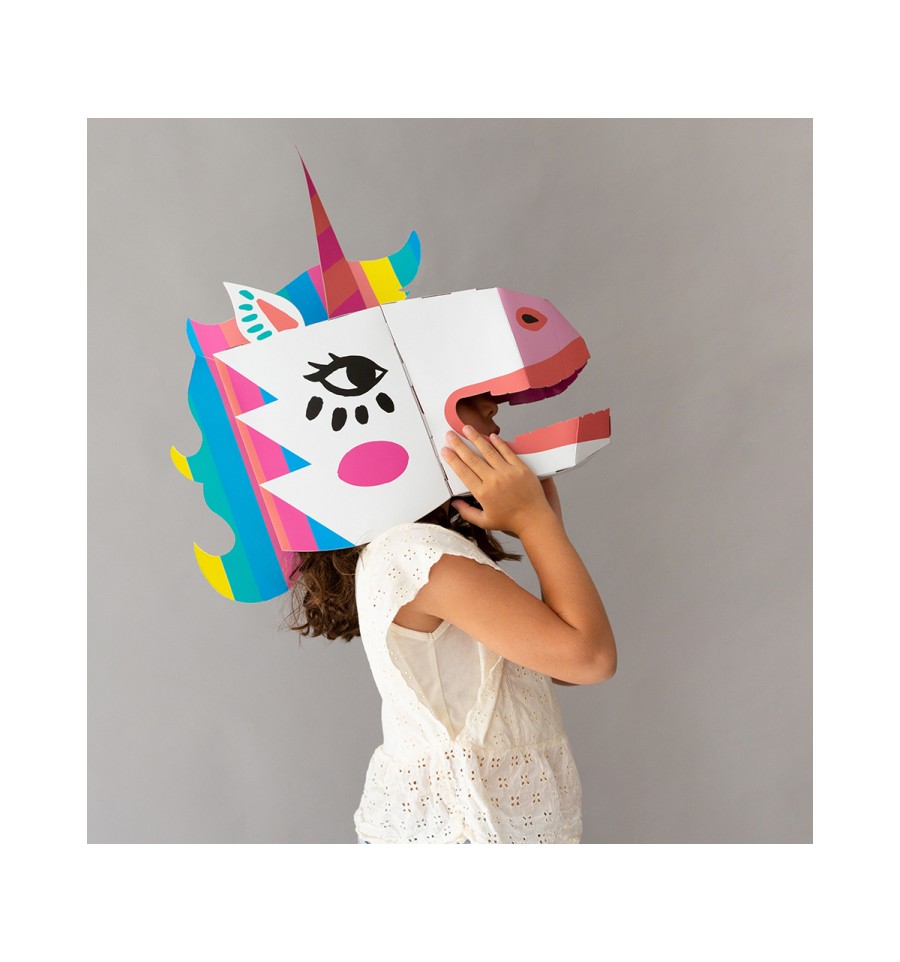 Livré à plat, ce masque en carton 3D en forme de tête de licorne est à monter soi-même.
