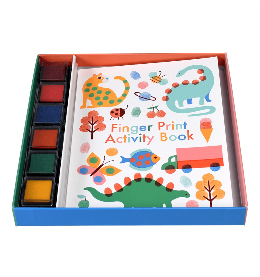Laissez les enfants mettre leurs bouts de doigts sur les tampons encreurs avant de les appliquer sur les pages du cahier pour créer de jolis décors amusants : les extraterrestres, le système solaire, les dinosaures ou encore des petits insectes.