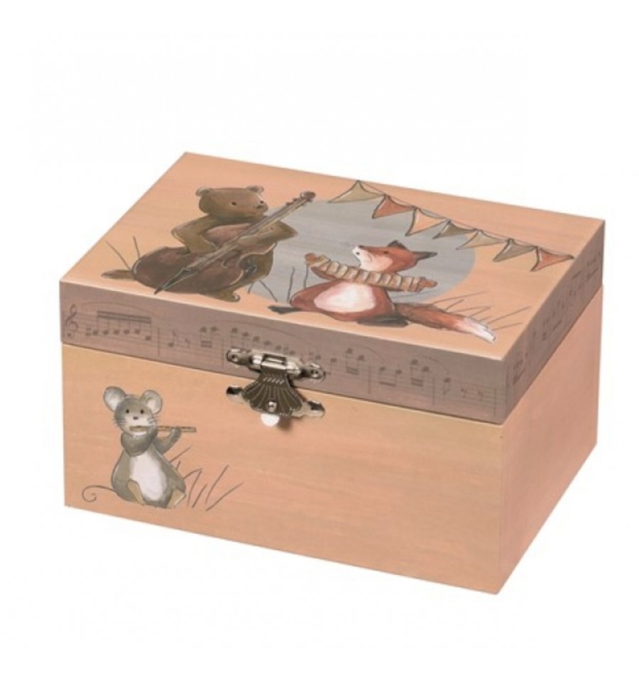 Très appréciées par les enfants, les boîtes à bijoux musicales permettent aussi de décorer une chambre de manière très personnalisée. Ici, avec ses motifs autour des animaux musiciens dans un environnement festif !
