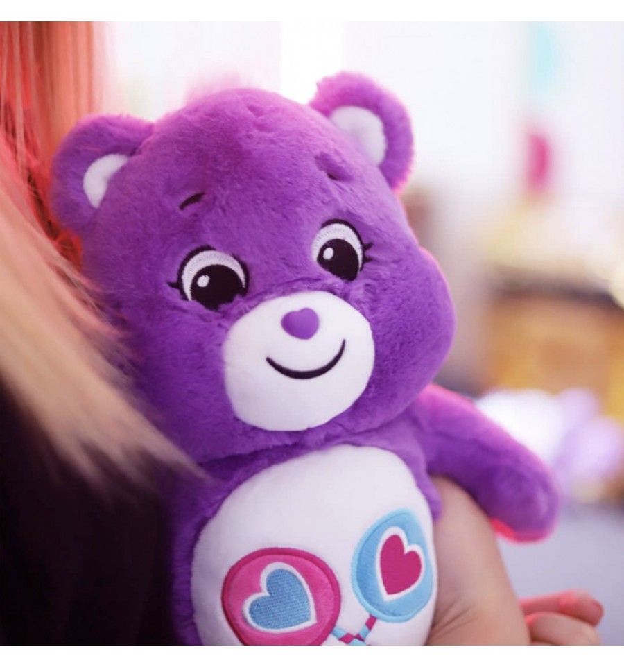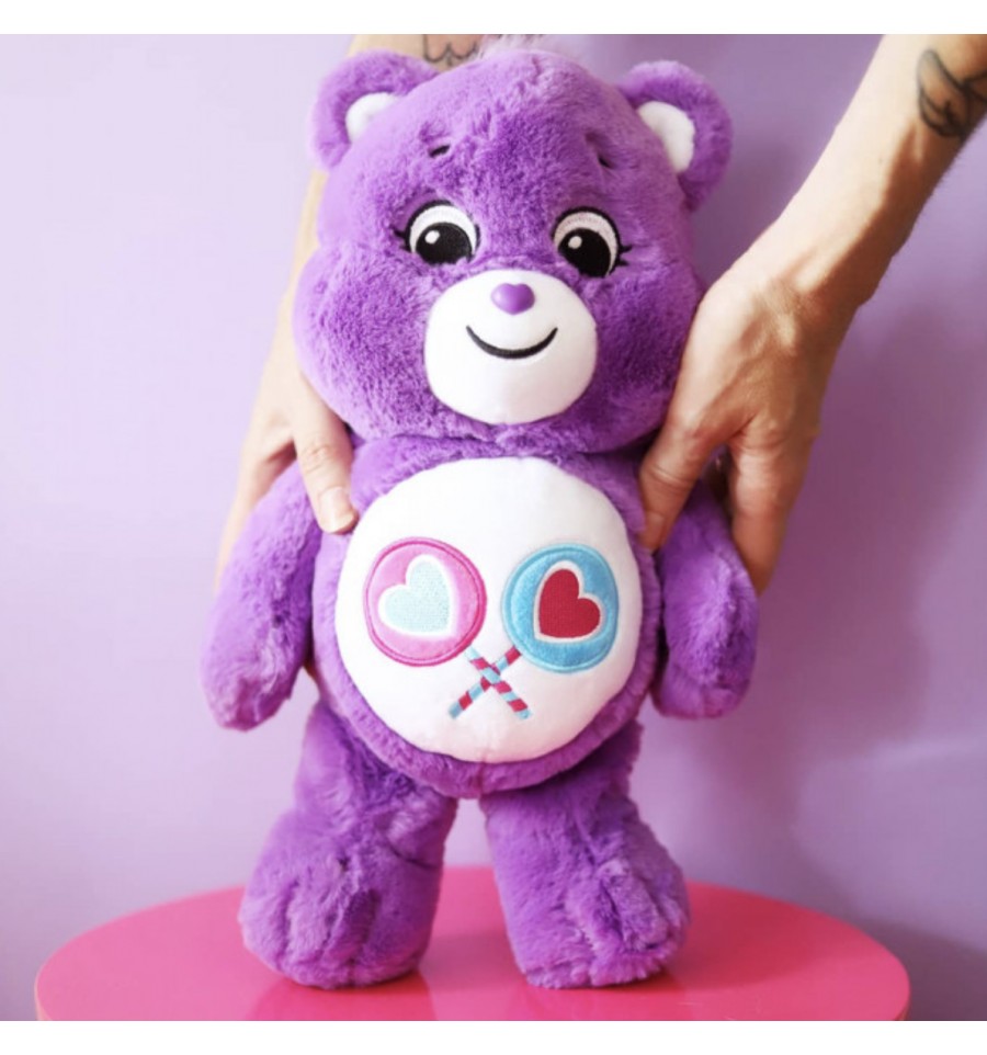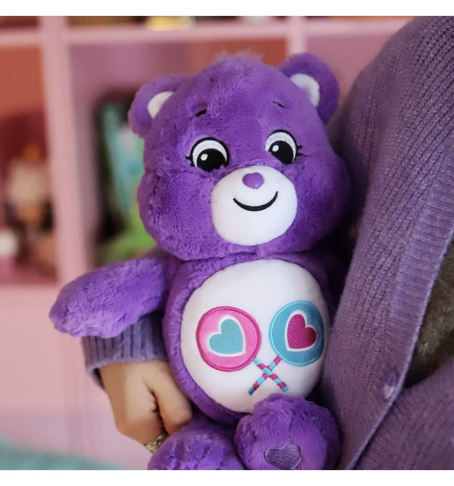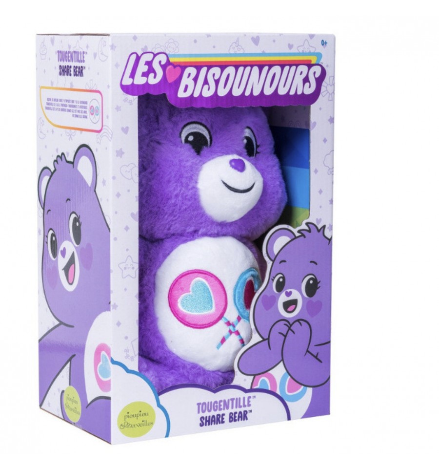 Découvrez ici Tougentille, le Bisounours violet, une sucette rose avec un coeur bleu à l'intérieur et une sucette rose avec un coeur bleu sur le ventre.