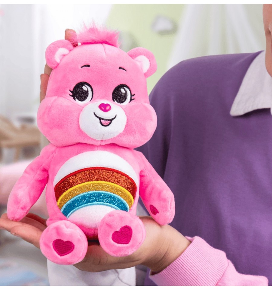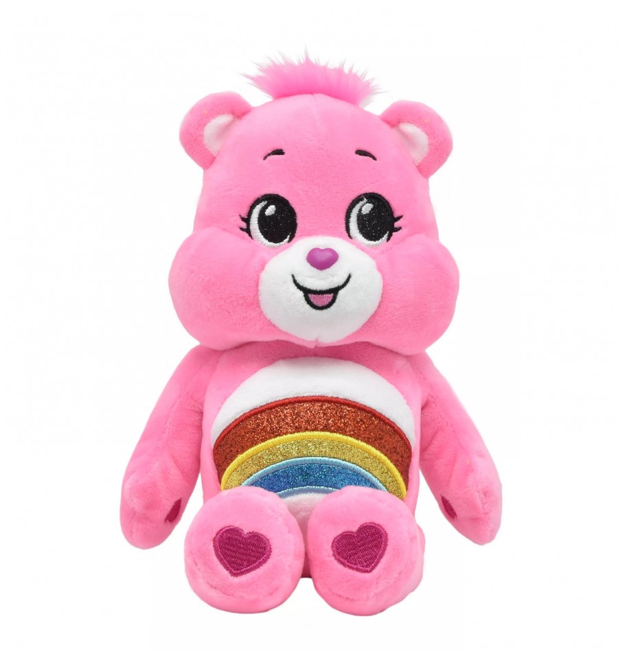 Découvrez ici Toucâlin, le Bisounours rose, avec un arc-en-ciel à paillettes sur son ventre !