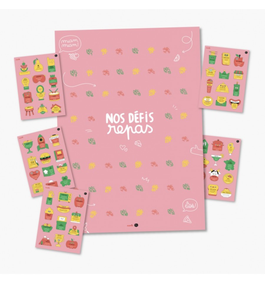 Découvrez un poster à partager en famille. Choisissez ensemble 52 stickers défis à essayer ! Un diner à la bougie ? un diner à manger avec les doigts etc... Mille idées pour que le repas devienne un moment génial de complicité, d'originalité et de partage rigolo !