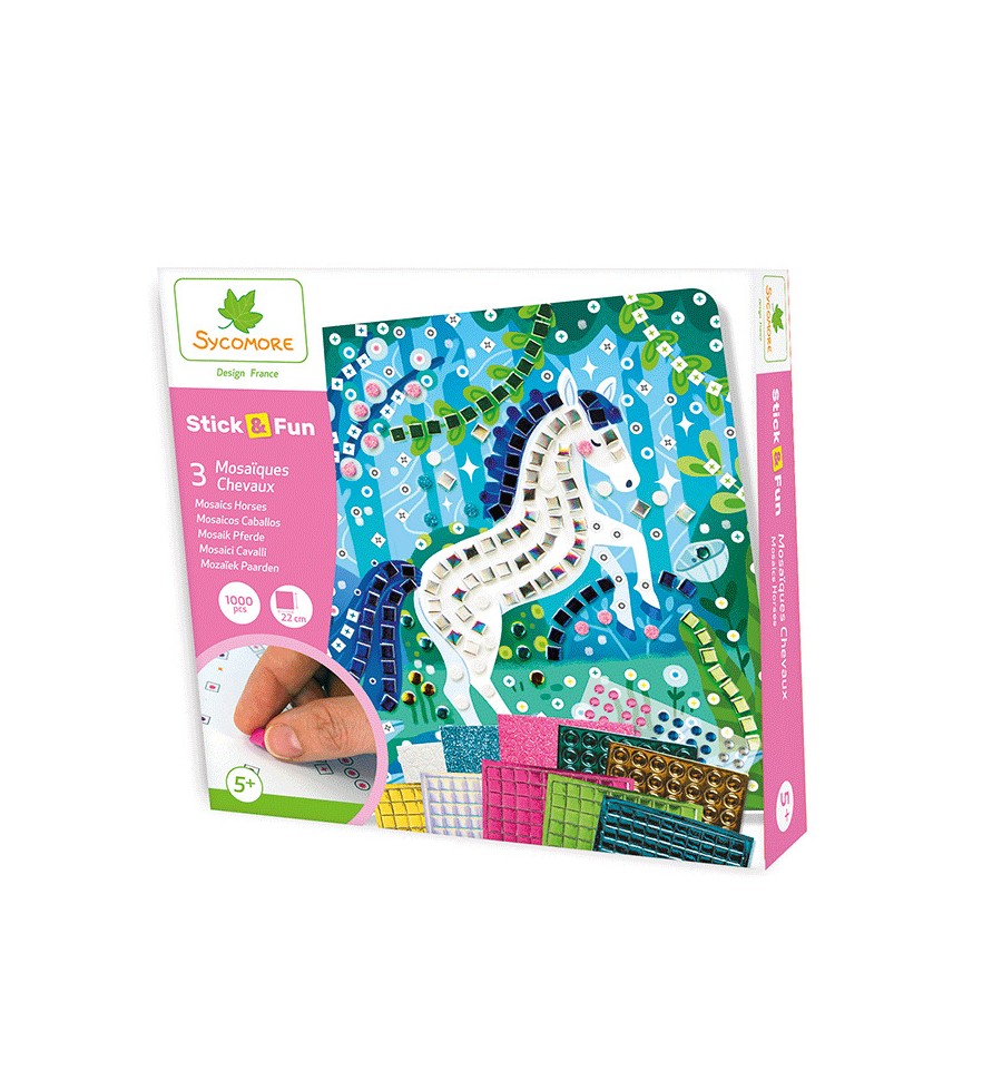 Grâce à ce kit créatif votre enfant pourra customiser trois grandes illustrations (un cheval blanc, une petite fille blonde qui enlace un cheval marron et un cheval noir avec un oiseau blanc posé sur son dos) avec des petits éléments tels des mosaïques pour un effet Wahou.