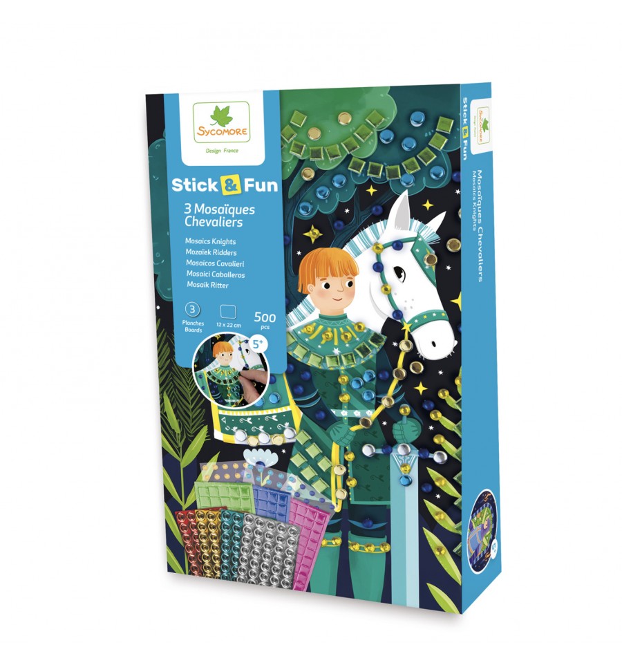 Grâce à ce kit créatif votre enfant pourra customiser trois grandes illustrations (un chevalier avec son fidèle destrier blanc, un chevalier avec son épée, et un chevalier à dos de cheval marron clair) avec des petits éléments tels des mosaïques pour un effet Wahou.