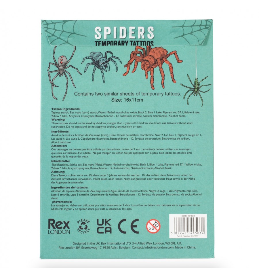 2 planches identiques avec plein de tatouages temporaires sur le thème des araignées, imaginées par Rex London !