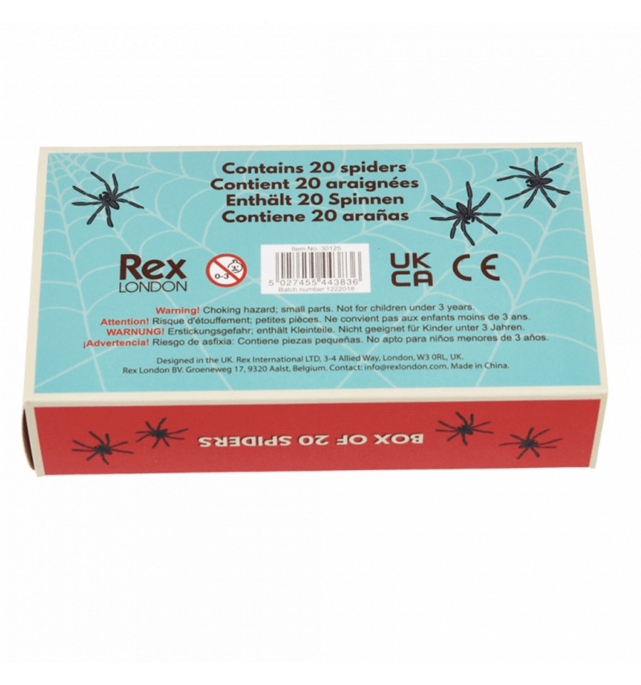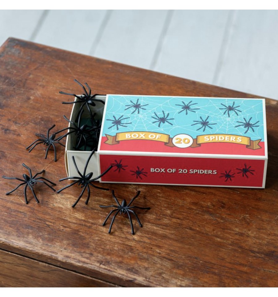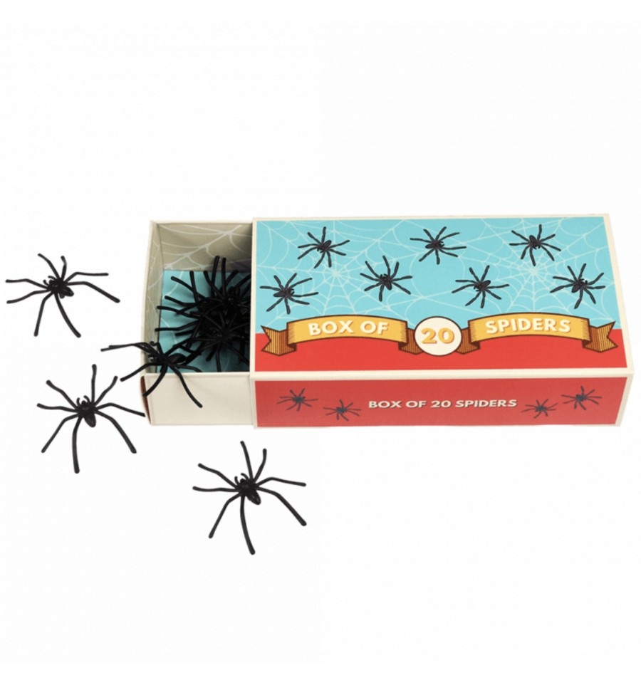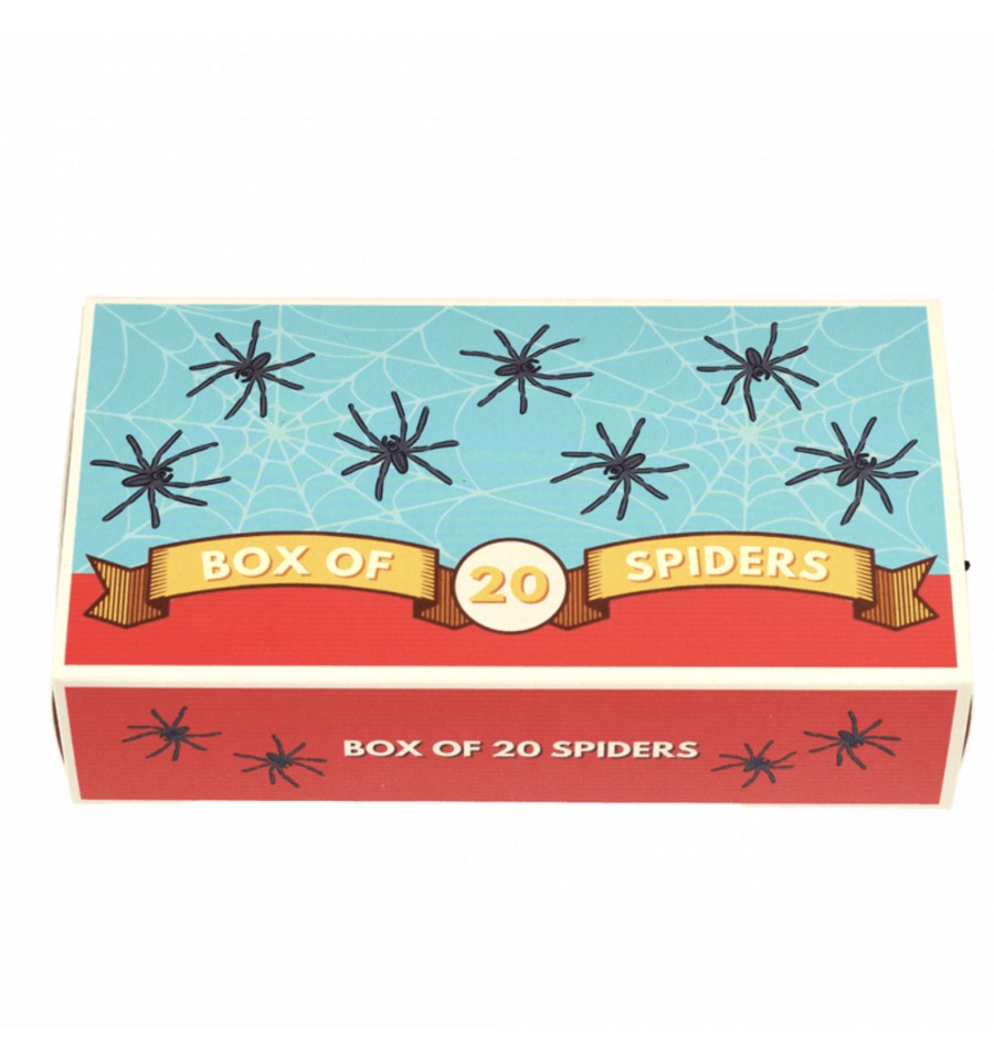 Cette jolie boîte en carton est remplie de 20 araignées noires en plastique prêtes à effrayer.