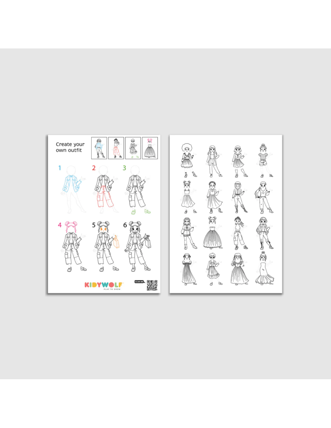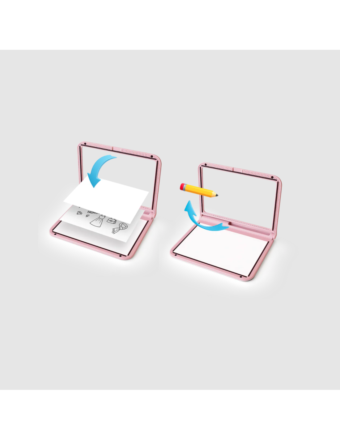 Sur la première face, grâce à un système de calques, ils pourront associer les silhouettes, les tenues, les accessoires...comme dans un vrai atelier de mode. Sur la seconde face, l'enfant trouvera un espace de dessin libre pour plus de fun et de créativité.