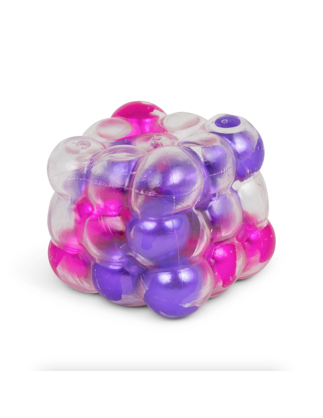 Cette balle anti-stress en forme de cube est remplie de billes multicolores.