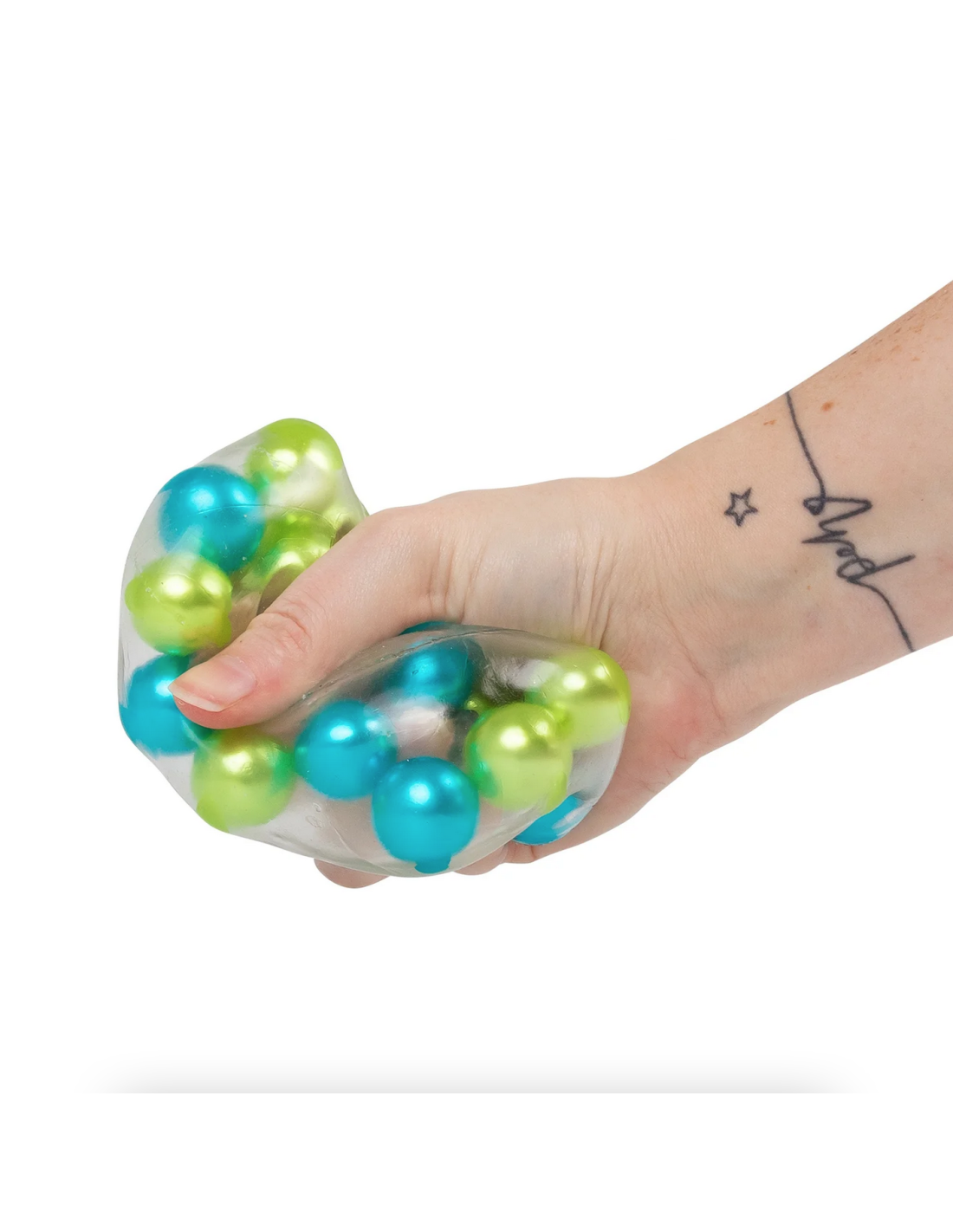 Cette balle anti-stress imaginée par Tobar est remplie de nombreuses billes multicolores.