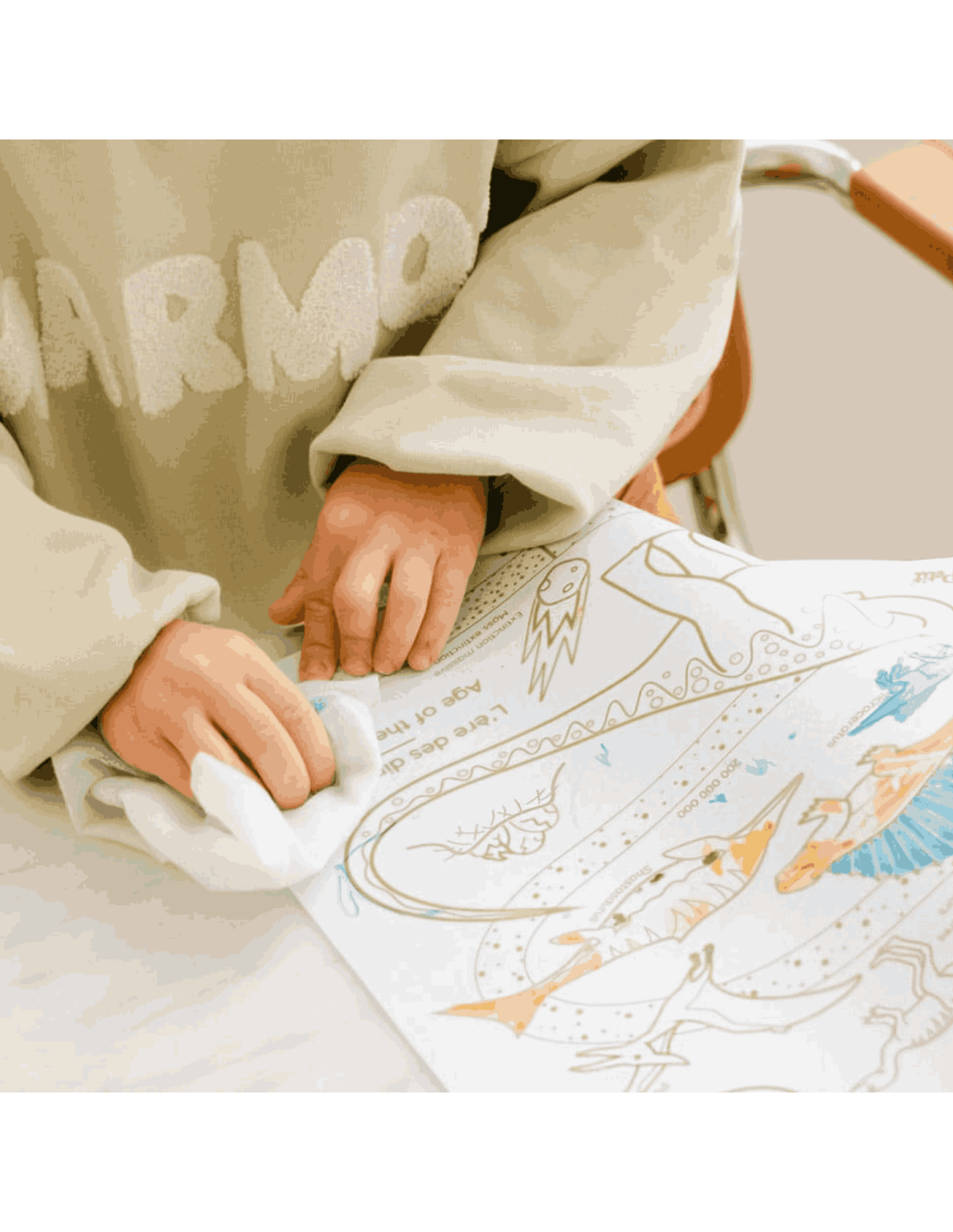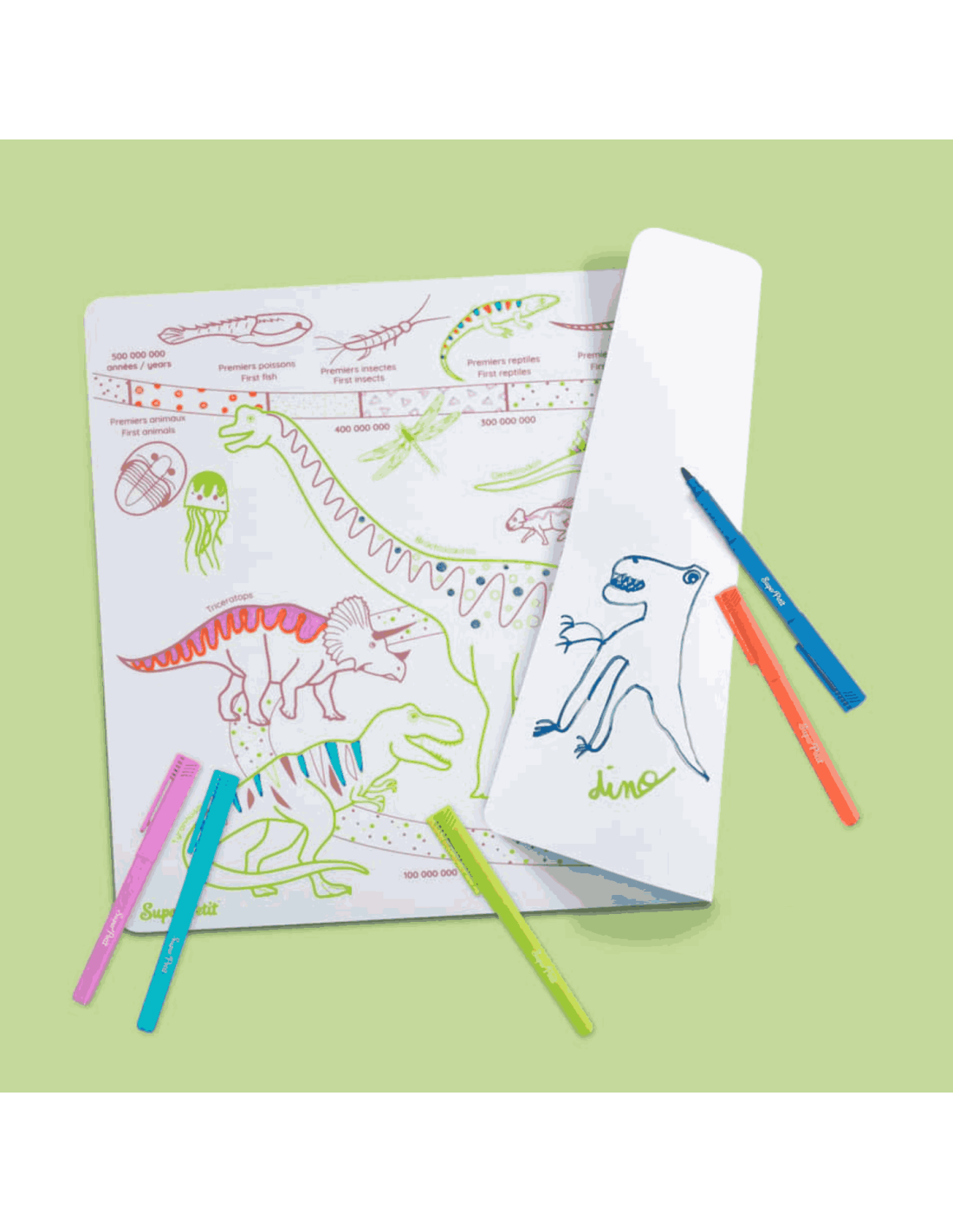 On apprend en s’amusant grâce à ce set en silicone dédié aux dinosaures : 1 côté coloriage pédagogique et 1 côté dessin livre (feutre effaçable inclus).