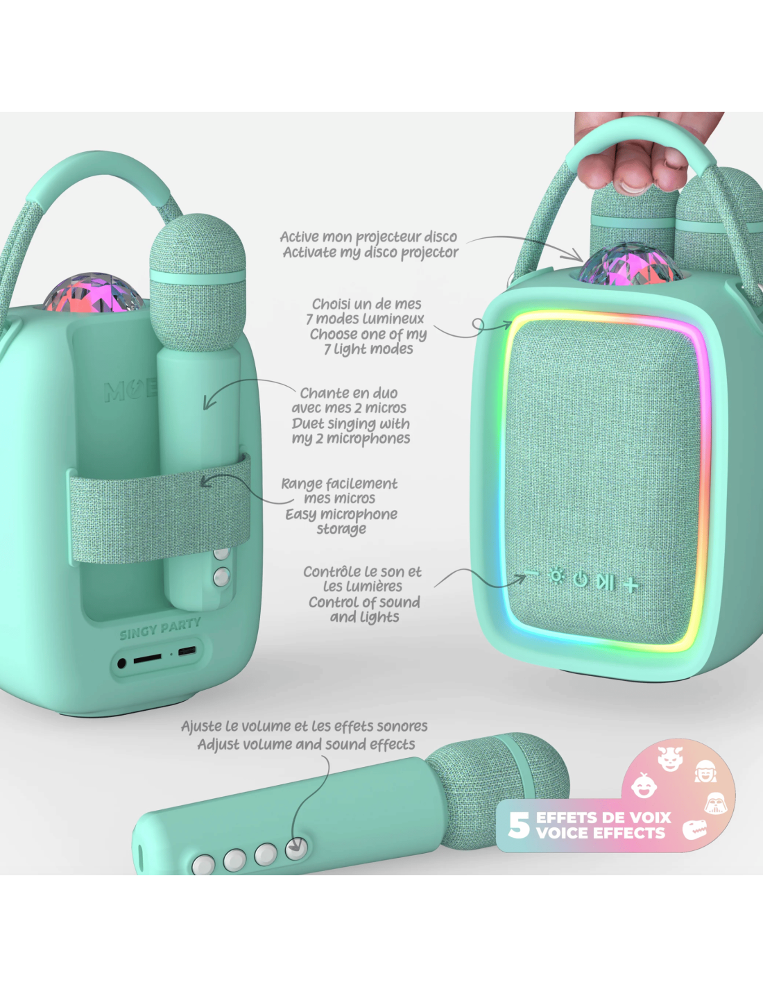 Cette enceinte bluetooth lumineusement merveilleuse (7 effets différents) vous permet d'écouter votre musique mais également de chanter à tue tête en modifiant votre voix grâce à ses micros et aux nombreux effets proposés.