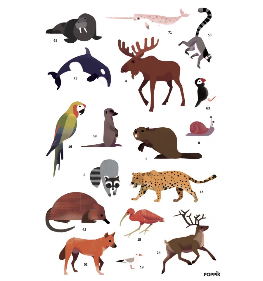 Ce poster Poppik permet à l'enfant de situer les animaux sur la carte du monde : le panda vit en Asie, le koala en Australie... Avant de coller chaque animal, il doit observer, comparer, identifier, ce qui lui permet de mémoriser les informations. Sur la légende du poster, retrouvez le nom des animaux en français et en anglais.