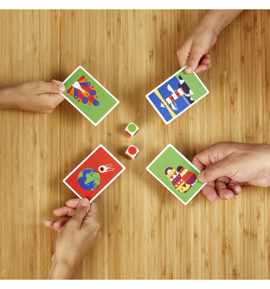 Les joueurs doivent trouver dans leur jeu une carte compatible avec les indications de couleurs, indiquées sur 2 dés. Le but du jeu est d’être le premier à se défausser de toutes ses cartes.