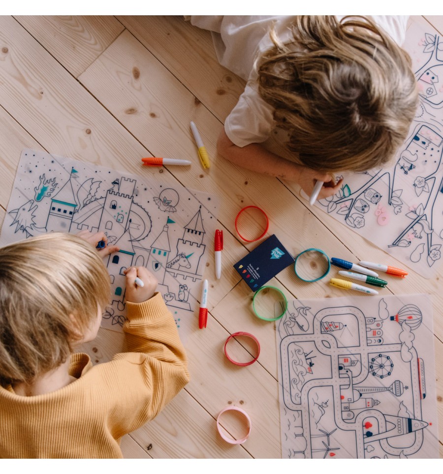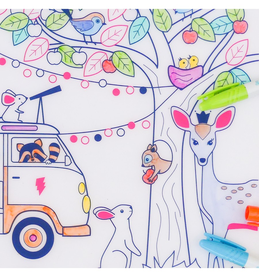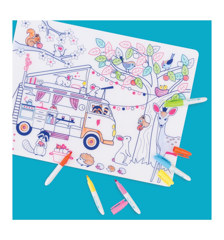 Ce set de table en silicone tout doux est à colorier grâce aux 5 feutres effaçables fourni.