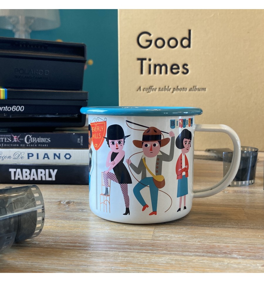 Une tasse en tôle émaillée dessinée par Ingela Arrhenius avec les représentations de 9 personnages de films célèbres : Indiana Jones, Amélie Poulain, Charlot, Bridget Jones, James Bond, Mia Wallace & Vincent Vega (Pulp Fiction), Alex Foley (Le Flic de Beverly Hills) et Sally Bowles (Cabaret).