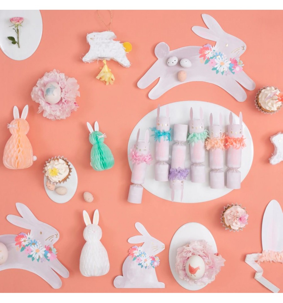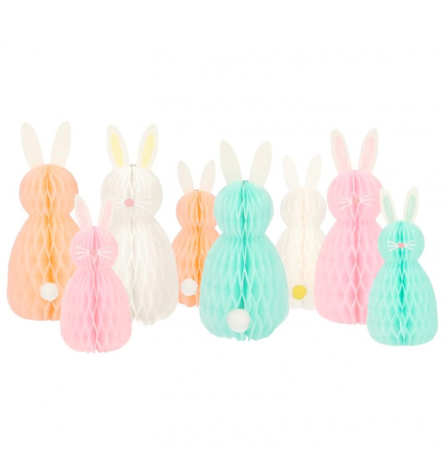 Simple décoration ou centre de table, ces 8 lapins Meri Meri de tailles et de couleurs différentes seront très simples à placer chez vous et apporteront une jolie touche de couleur dans votre décoration de Pâques.