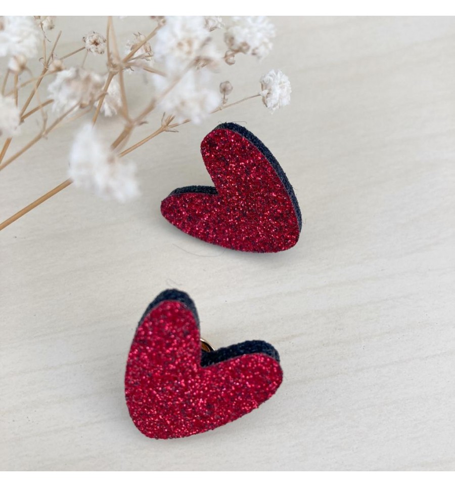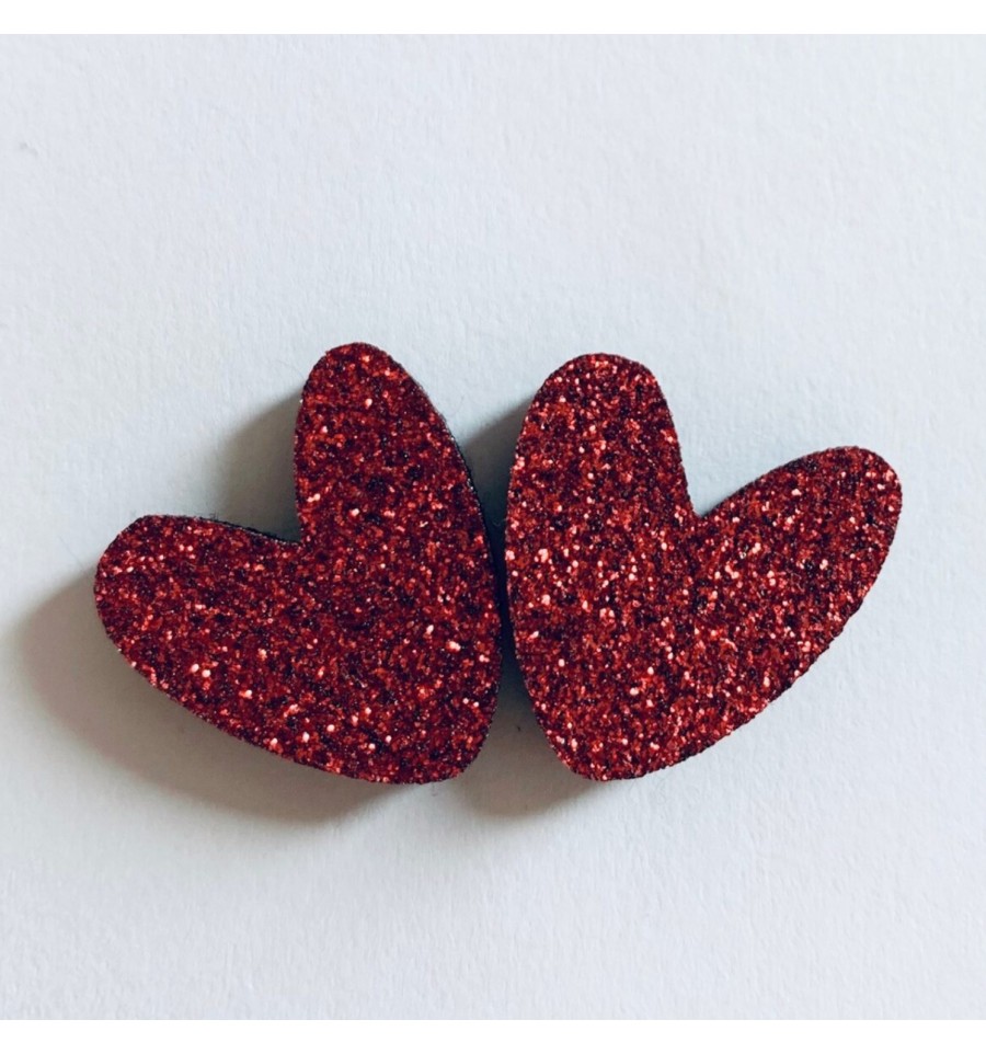 Ce duo de pin's en forme de coeurs rouges est en feutrine et en paillettes.