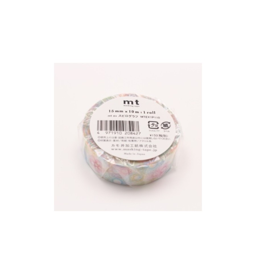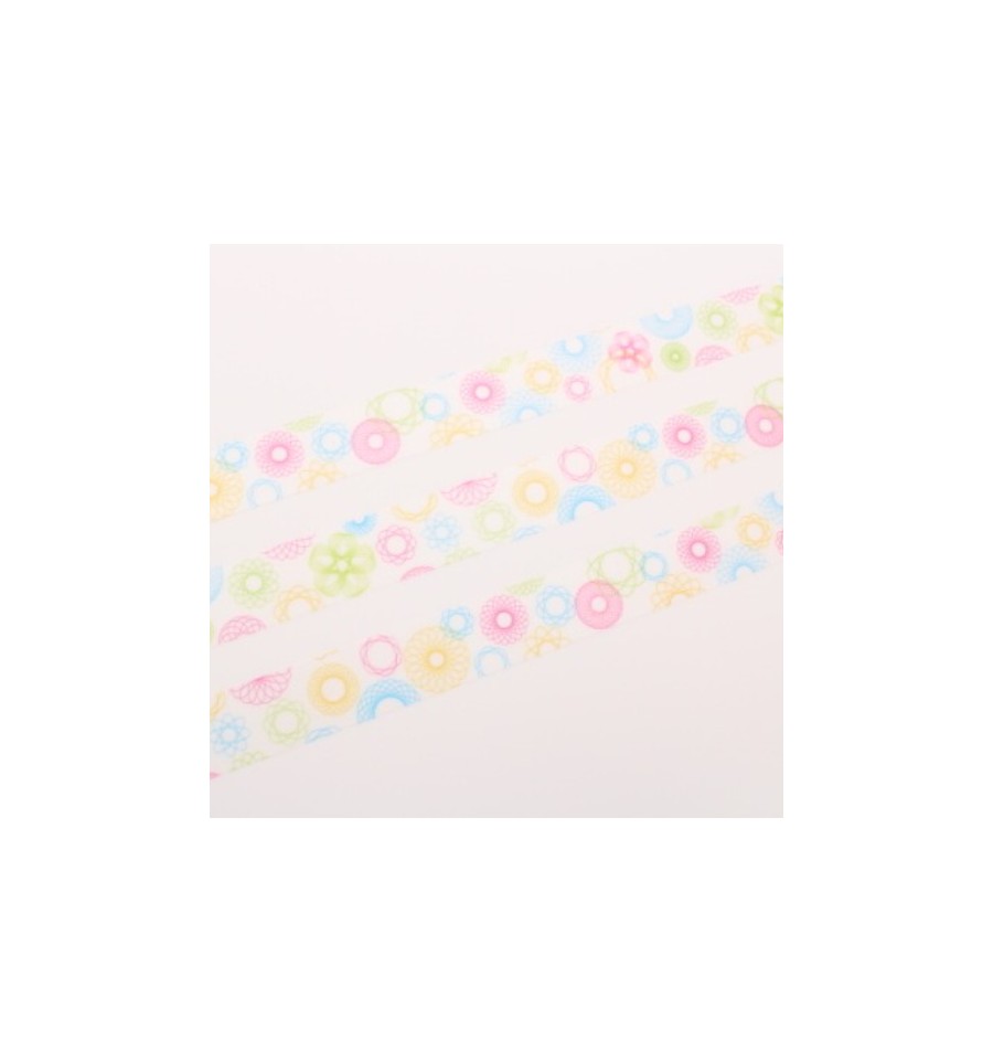 Un rouleau de masking tape aux formes géométriques multicolores qui fait 15 mm de large sur 10 m de long.
