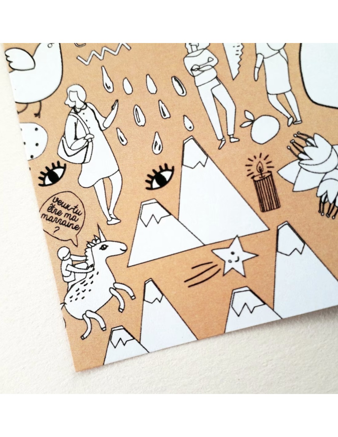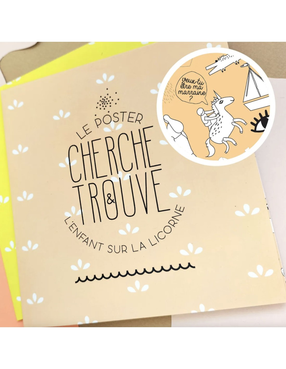 Avec ce poster "cherche et trouve", la future marraine va devoir trouver l'enfant sur la licorne et découvrir la phrase "Veux tu être ma marraine ?"