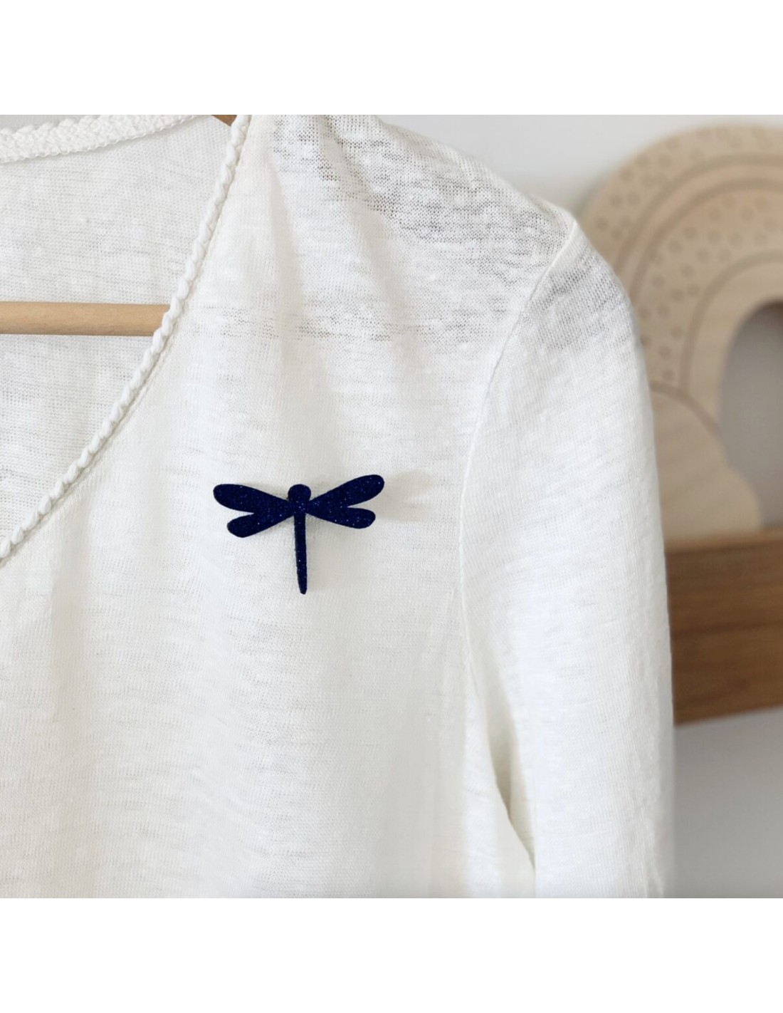 Ce pin's en forme de libellule est en feutrine recouverte de paillettes bleues.