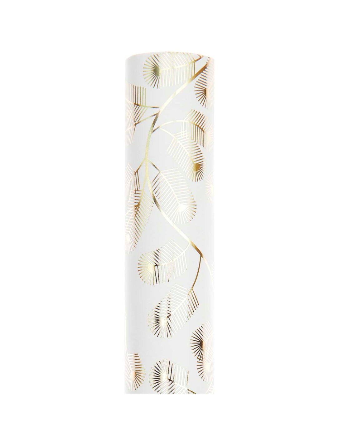 Papier cadeau blanc avec des branches de sapin dorées brillantes, idéal pour confectionner vos emballages cadeaux ou toutes autres créations en papier.
