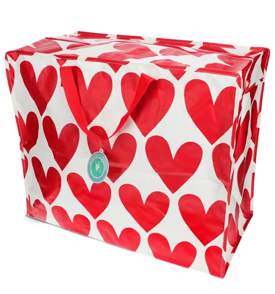 Sac de rangement blanc avec de gros cœurs rouges avec fermeture éclair. Réalisé à partir de bouteilles en plastiques recyclées.