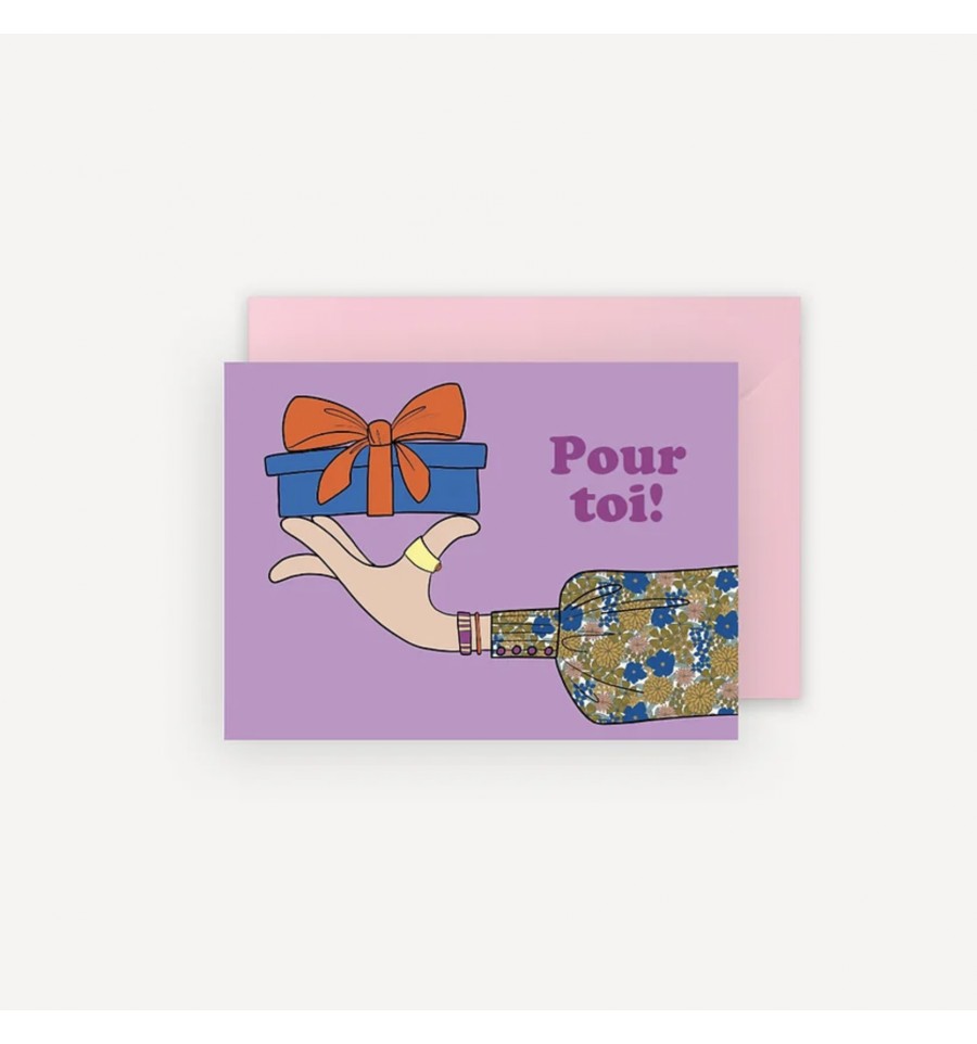 A la boutique, on est absolument fans de la fraicheur de ses illustrations. Cette carte violette avec ce bras tendu portant un cadeau sera parfaite à offrir !