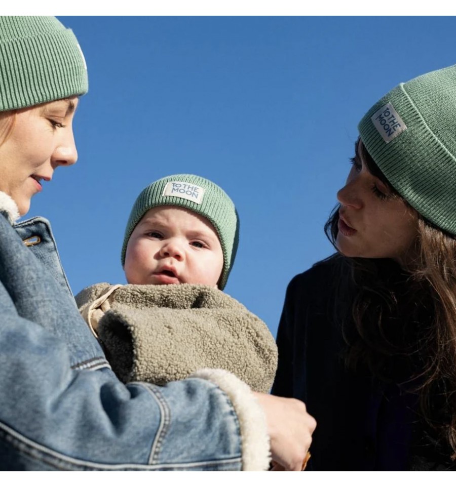 Ce bonnet vert sauge en coton biologique existe en taille enfant et taille adulte pour un look matchy-matchy.