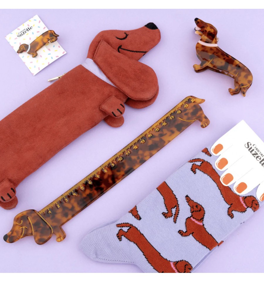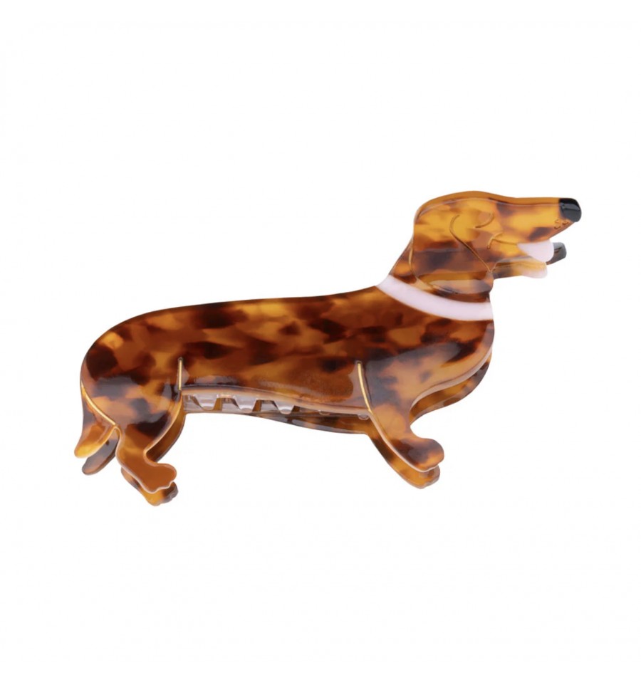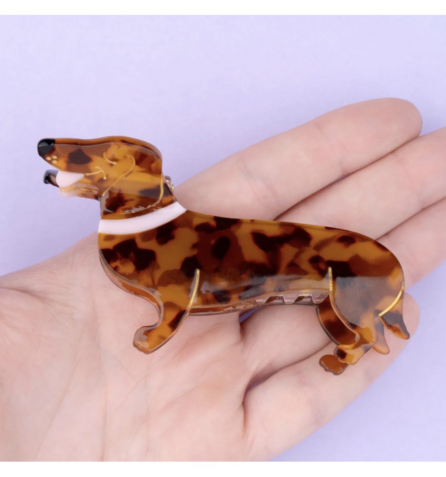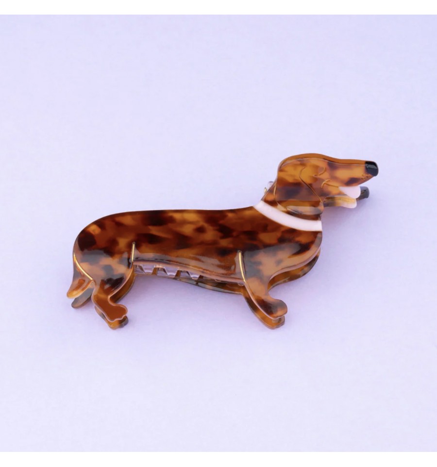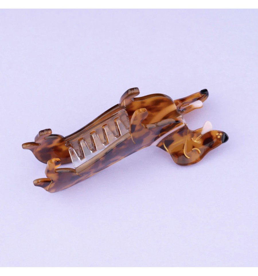 Coucou Suzette a imaginé cette grande pince à cheveux en forme de ce célèbre chien saucisse : le teckel.