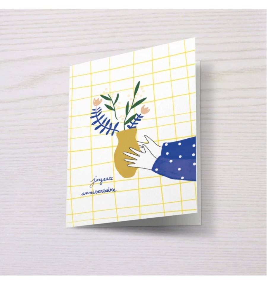 Deux bras tendus offrent un beau vase rempli de jolies fleurs aux couleurs vintages. Cette carte double au fin quadrillage jaune est idéale pour souhaiter un joyeux anniversaire à un de vos proches.
