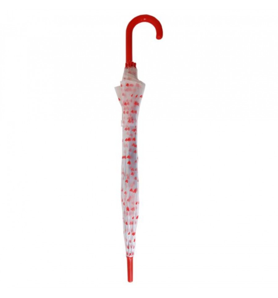 Un joli parapluie transparent, illustré de coeurs rouges, destiné aux adultes.